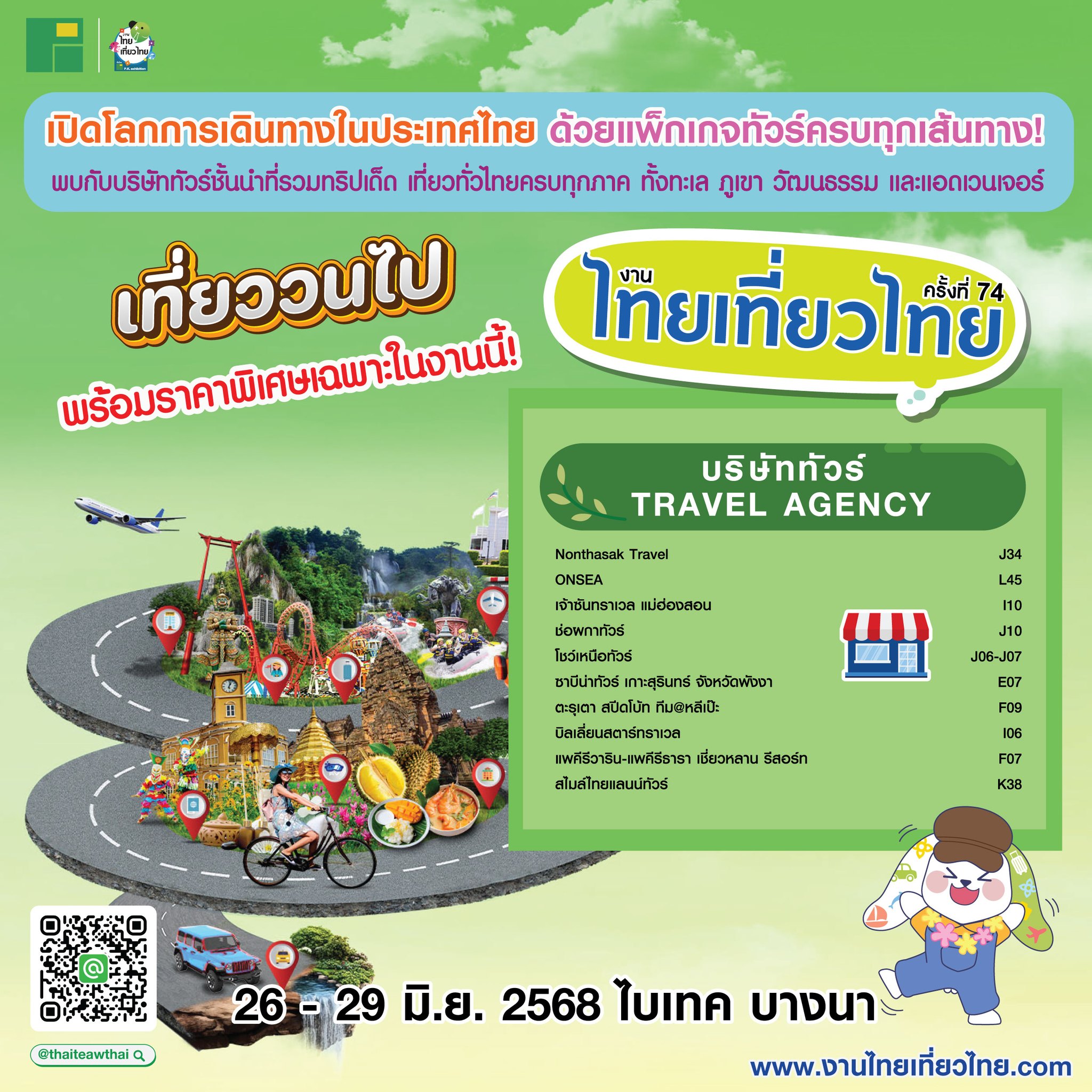 พบกับบริษัททัวร์ชั้นนำที่รวมทริปเด็ด เที่ยวทั่วไทยครบทุกภาค ทั้งทะเล ภูเขา วัฒนธรรม และแอดเวนเจอร์ พร้อมราคาพิเศษเฉพาะในงานนี้!
