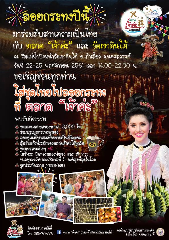 ร่วมสืบสานความเป็นไทย ใส่ชุดไทยไปลอยกระทง กับตลาด "เจ้าค่ะ" และ วัดเขาดินใต้ ณ ริมแม่น้ำปิงหน้าวัดเขาดินใต้ อ.เก้าเลี้ยว จ.นครสวรรค์