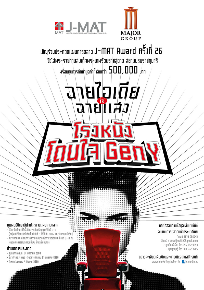 โครงการยุวสมาชิกสมาคมการตลาด แห่งประเทศไทย (J-MAT) ร่วมกับ บริษัท เมเจอร์ซีนีเพล็กซ์ กรุ้ป จำกัด (มหาชน) ผู้นำด้านอุตสาหกรรมโรงภาพยนตร์และศูนย์รวมความบันเทิงครบวงจรในประเทศไทย ขอเชิญนิสิต นักศึกษา ส่งผลงานเข้าร่วม โครงการประกวดแผนการตลาด J-MAT AWARD ครั้งที่ 26 ในหัวข้อ "ฉายไอเดียให้ฉายแสง โรงหนังโดนใจ Gen Y" ชิงโล่พระราชทานของสมเด็จพระเทพรัตนราชสุดาฯ สยามบรมราชกุมารี พร้อมทุนการศึกษามูลค่ารวมกว่า 500,000 บาท