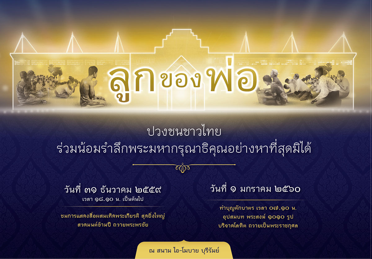 จังหวัด บุรีรัมย์เตรียมจัดงาน “ลูกของพ่อสำนึกในพระมหากรุณาธิคุณหาที่สุดมิได้” ระหว่างวันที่ 26 ธันวาคม 2559 ถึงวันที่ 1 มกราคม 2560 ณ บริเวณด้านหน้าสนามไอโมบายสเตเดี้ยม โดยมีกิจกรรมต่าง ๆ เพื่อแสดงพลังความสำนึกในพระมหากรุณาธิคุณและแสดงความอาลัยแด่พระบาทสมเด็จพระปรมินทรมหาภูมิพลอดุลยเดช ของพสกนิกรชาวจังหวัดบุรีรัมย์