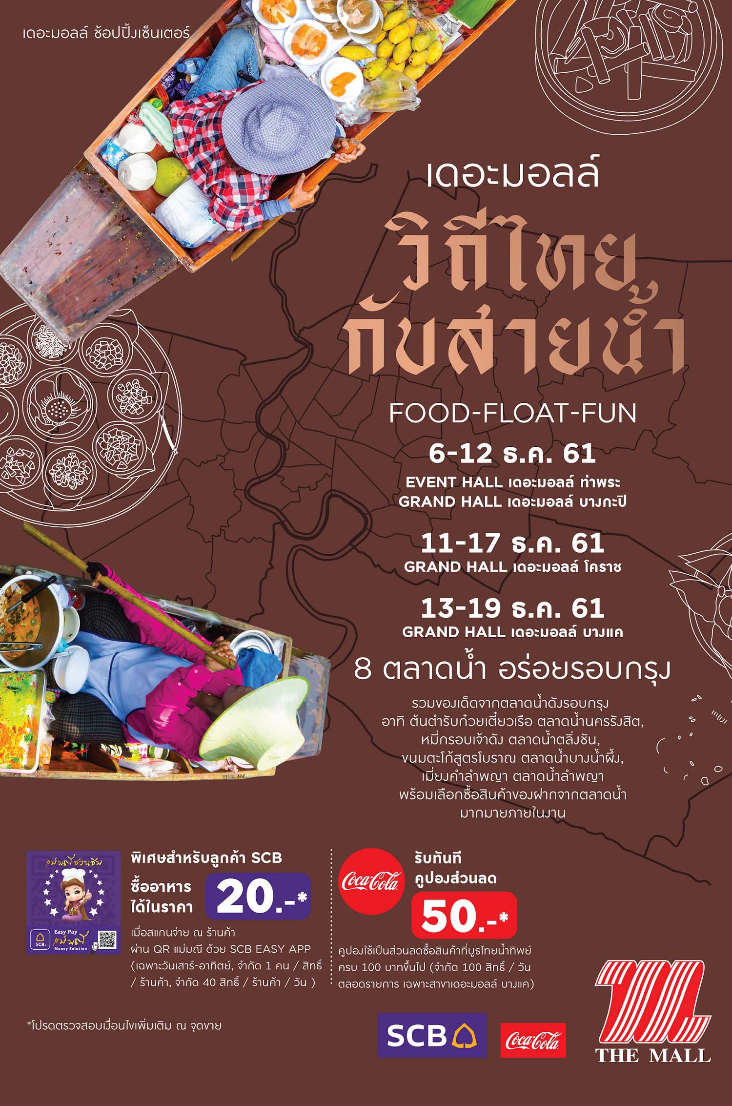 เดอะมอลล์ ช้อปปิ้งเซ็นเตอร์ ร่วมกับ ธนาคารไทยพาณิชย์ จำกัด (มหาชน) และ บริษัท ไทยน้ำทิพย์ คอมเมอร์เชียล จำกัด จัดงาน "เดอะมอลล์วิถีไทย กับสายน้ำ Food-Float-Fun" รวบรวมของเด็ด ของอร่อยจาก 8 ตลาดน้ำชื่อดังทั่วเมืองกรุง รื่นเริงในบรรยากาศสุดย้อนยุค สนุกสุขสันต์กับการลิ้มรสเมนูอร่อยจากร้านค้าไฮไลท์พบกับ ก๋วยเตี๋ยวเรือสูตรต้นตำรับ ที่มีชื่อเสียงมายาวนานกว่า 60 ปี ร้านก๋วยเตี๋ยวเรือ โกฮับ รังสิตเจ้าเก่า ตลาดน้ำนครรังสิต, ก๋วยเตี๋ยวเส้นปลาหลากสี อร่อยเด็ดด้วยน้ำซุปสูตรปลาย่างจากเมืองจีน ร้านโกอ่างเส้นปลา ตลาดน้ำขวัญเรียม, ผัดไทยกากหมู นำกากหมูผัดคลุกเคล้าผัดไทย เพิ่มความหอมกรุ่นสุดอร่อยสูตรเด็ดร้านยายกิ่ง ตลาดน้ำคลองลัดมะยม, บ๊ะจ่างห่อใบบัว สินค้า OTOP จังหวัดสมุทรสงครามจากตลาดน้ำอัมพวา, เมี่ยงคำสูตรโบราณ ปลูกในโรงปิดแบบแปลงปลอดสารพิษ จากตลาดน้ำลำพญา, หมี่กรอบโบราณ หอมโชยด้วยกลิ่นส้มซ่า รสสัมผัสกรุบกรอบ ร้านแม่เล็ก ตลาดน้ำตลิ่งชัน, ขนมตาล ร้านป้าไข่ และขนมปังสังขยา หอมนุ่มอร่อย มีให้เลือกหลากหลายรสชาติ ร้านปังพอนด์ ตลาดน้ำดอนหวาย, ขนมตะโก้ สูตรโบราณอัดแน่นไส้ในกระทงใหญ่ ร้านแม่พิมพ์ใจ ตลาดน้ำบางน้ำผึ้ง และอีกหลากหลายเมนูให้เหล่านักชิมได้ลิ้มรสความอร่อย