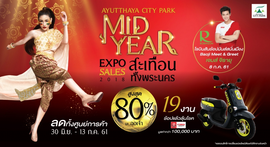 ศูนย์การค้าอยุธยาซิตี้พาร์คท้าดวลนักช้อปกับกิจกรรม “Ayutthaya City Park Mid Year Expo Sales 2018” ท้าดวลนักช้อป ลดกระหน่ำทั้งศูนย์การค้าฯ สูงสุด 80 % กับสินค้าแบรนด์ดังมากมาย ครบทุกความต้องการ จัดเต็มทุกกิจกรรม แถม!!! ช้อปครบ 1,000 บาท ลุ้นโชค รถจักรยานยนต์ยามาฮ่า Qbix และของรางวัลอีกมากมาย รวมมูลค่ากว่า 100,000 บาท
