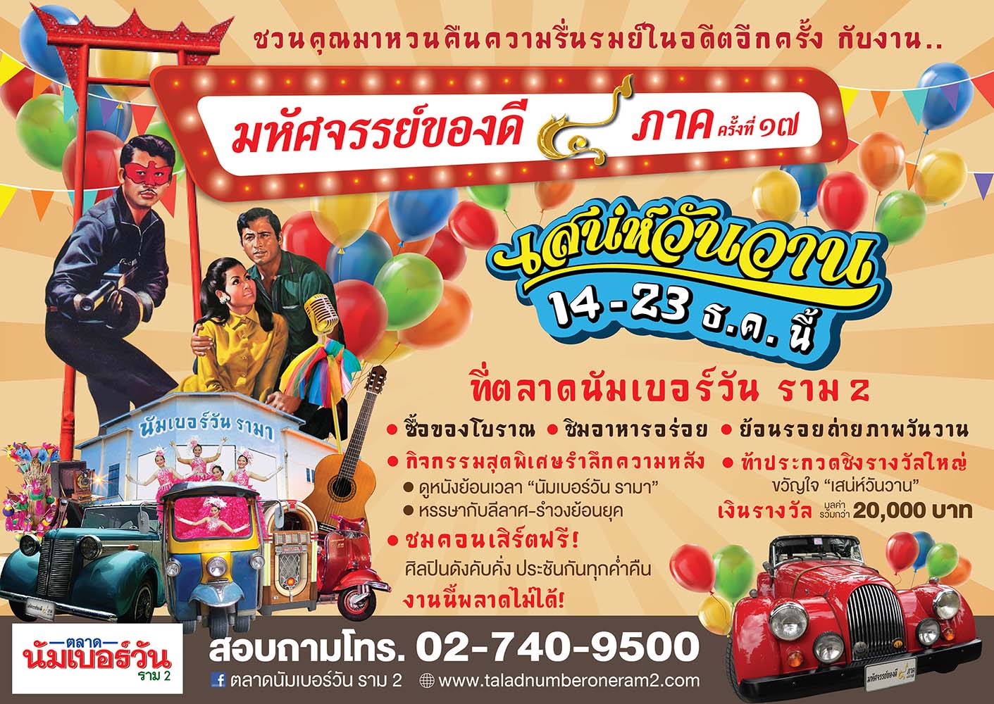 หน้าหนาวปีนี้บรรยากาศเย็นๆ ใกล้ช่วงเทศกาลงานปีใหม่แล้ว สำหรับผู้ที่กำลังมองหาสถานที่เที่ยวแบบบรรยากาศย้อนวันวานหวนคืนสู่ความรื่นร่มย์ในอดีตอีกครั้ง ขอแนะนำและเชิญชวนมาเที่ยวงานมหัศจรรย์ของดี 4 ภาค ครั้งที่ 17 ในธีมย้อนยุค "เสน่ห์วันวาน" โดยภายในงานมีสินค้า อาหารโบราณ ของสะสมรุ่นเก๋าหายาก อิ่มอร่อยกับอาหารคาวหวานไทยโบราณนานาชนิด และมุมถ่ายภาพที่ระลึก นอกจากนี้ยังมีกิจกรรมรำลึกความหลังให้ผู้ที่สนใจมาร่วมสนุกมากมาย เช่น ฉายหนังกลางแปลงย้อนเวลา, ลีลาศ-รำวงย้อนยุค, ละครลิง, ชักภาพขาวดำกับห้องภาพโบราณ, ตัดผมวินเทจ เป็นต้น สาวกวันวานรุ่นเก๋าห้ามพลาดเตรียมตัวแต่งชุดย้อนวันวานมาจัดเต็มพร้อมถ่ายภาพให้เข้ากับธีมงานแบบชิคๆ เพื่อมาปักหมุดเช็คอินกันได้ที่ตลาดนัมเบอร์วันราม 2