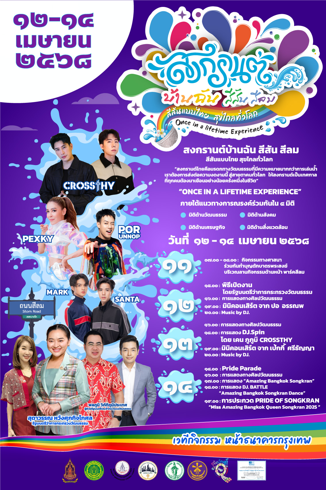 14 เม.ย. 2568: ชมขบวน PRIDE PARADE “สงกรานต์บ้านฉัน สีสัน สีลม” ชมการแสดงศิลปวัฒนธรรมร่วมสมัย การแสดง DJ.BATTLE และการประกวด Miss Amazing Bangkok Queen Songkran 2025
