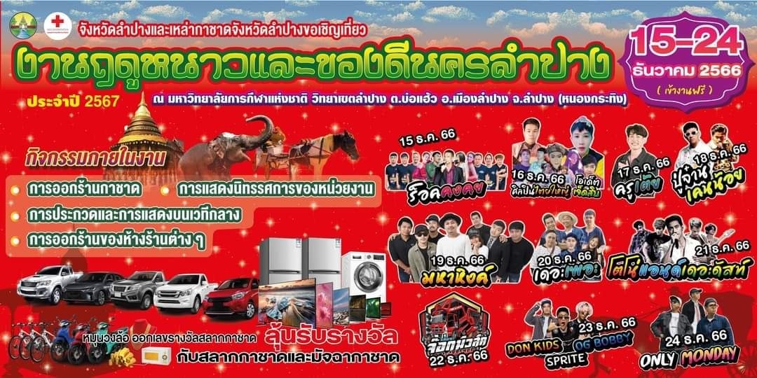 จังหวัดลำปาง ขอเชิญเที่ยวงาน ฤดูหนาวและของดีนครลำปาง ประจำปี 2566 ระหว่างวันที่ 15 - 24 ธันวาคม 2566 ณ มหาวิทยาลัยการกีฬาแห่งชาติ วิทยาเขตลำปาง ตำบลบ่อแฮ้ว อำเภอเมืองลำปาง จังหวัดลำปาง (หนองกระทิง)