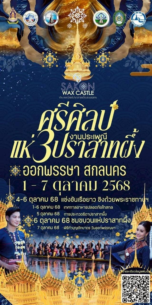 ขอเชิญเที่ยวงานประเพณีแห่ปราสาทผึ้งและแข่งขันเรือยาว ชิงถ้วยพระราชทานฯ จังหวัดสกลนคร ประจำปี 2568 ระหว่างวันที่ 1 - 7 ตุลาคม 2568