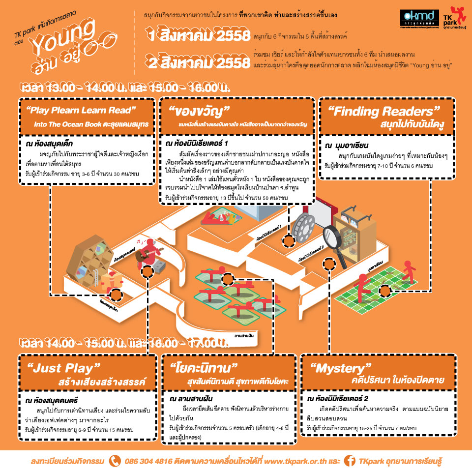 - วันเสาร์ที่ 1 สิงหาคม 2558 13.00-17.00 น. ณ อุทยานการเรียนรู้ TK park สนุกกับ 6 กิจกรรมใน 6 พื้นที่สร้างสรรค์ในอุทยานการเรียนรู้ TK park