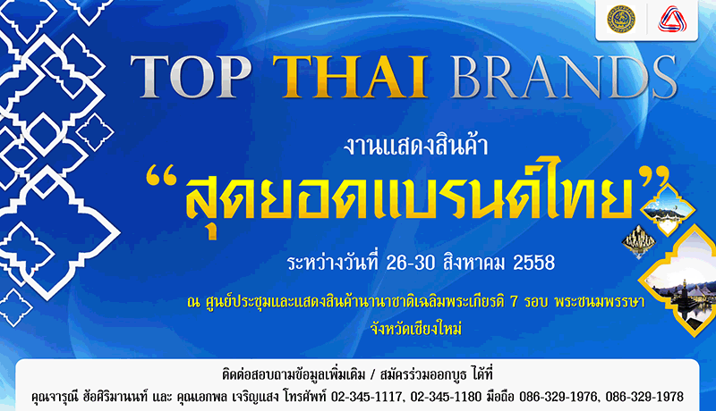 ขอเชิญเข้าร่วมงานแสดงสินค้าสุดยอดแบรนด์ไทย "TOP THAI BRANDS" ระหว่างวันที่ 26 – 30 สิงหาคม 2558 ณ ศูนย์ประชุมและแสดงสินค้านานาชาติเฉลิมพระเกียรติ 7 รอบ พระชนมพรรษา อำเภอเมือง จังหวัดเชียงใหม่