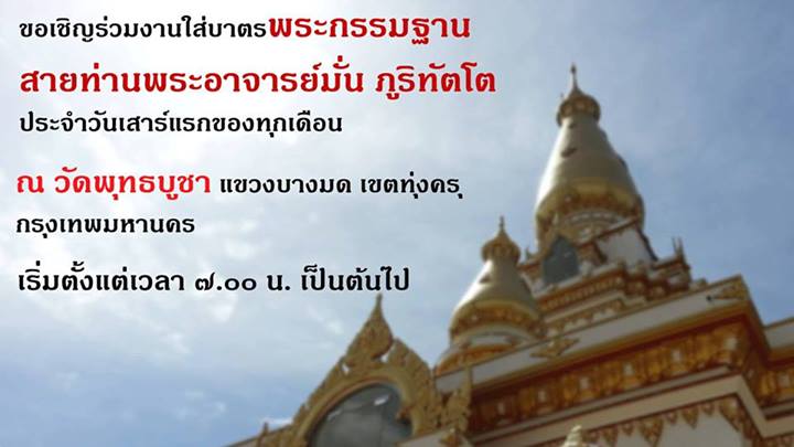 กำหนการทำบุญตักบาตรและฟังธรรมพระกัมมัฎฐาน (สายหลวงปู่มั่น ภูริทัตตะเถระ) (ทุกวันเสาร์ต้นเดือน) เวลา 6.30 - 10.30 น. ณ ศาลาการเปรียญวัดพุทธบูชา ถนนพุทธบูชา แขวงบางมด เขตทุ่งครุ กรุงเทพมห�