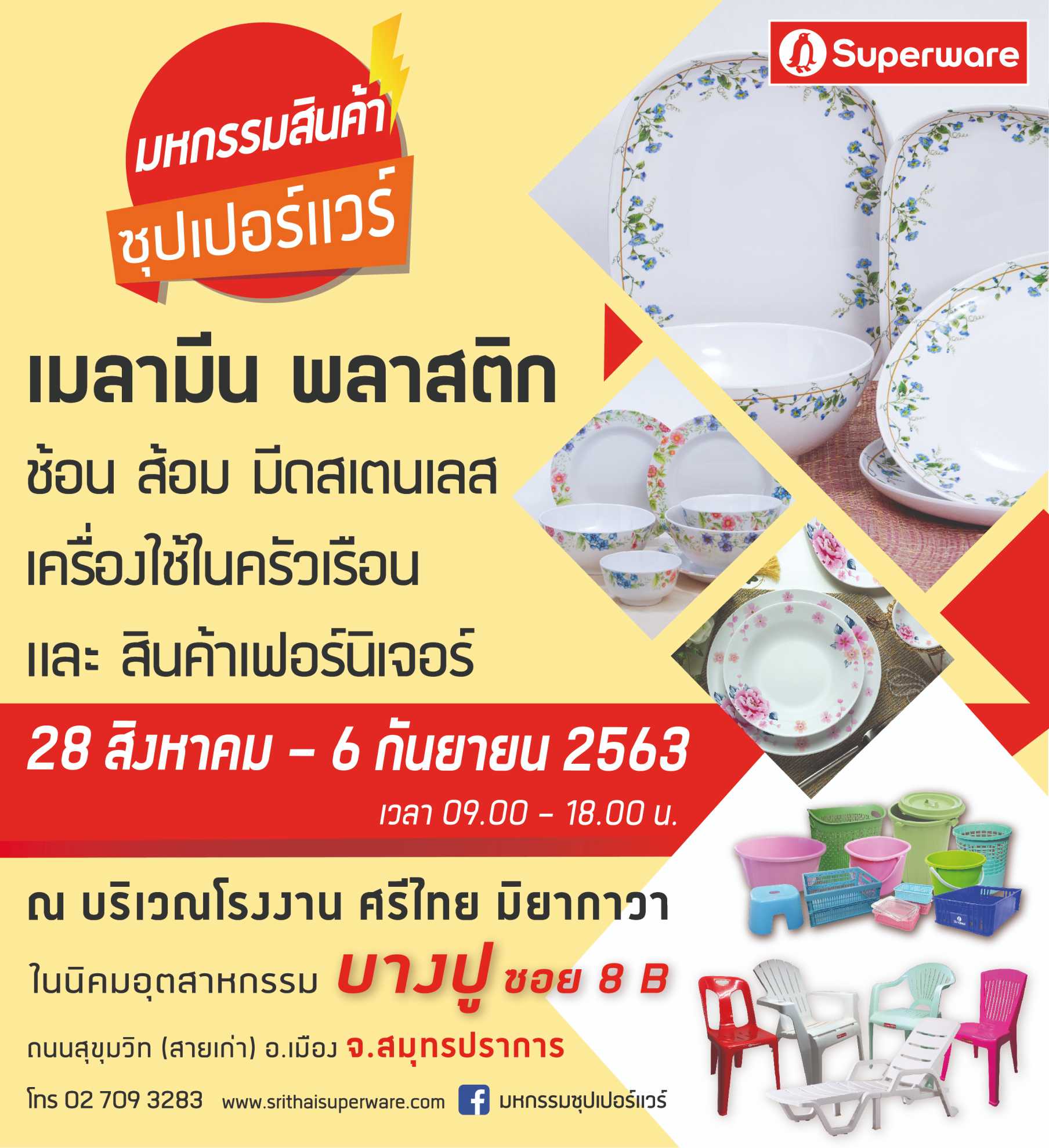 บมจ.ศรีไทยซุปเปอร์แวร์ ผู้ผลิตสินค้าเมลามีนและพลาสติก ได้จัดมหกรรมสินค้าซุปเปอร์แวร์ มีทั้งสินค้าเมลามีน พลาสติก ช้อน ส้อม มีด สแตนเลส เครื่องใช้ในครัวเรือน โต๊ะ เก้าอี้พลาสติก ที่เหลือจากการส่งออกหรือมีตำหนิเล็กน้อย ตั้งแต่วันที่ 28 สิงหาคม ถึง 6 กันยายน 2563 เวลา 09.00-18.00 น. ณ บริเวณโรงงาน ศรีไทย มิยากาวา ในนิคมอุตสาหกรรม บางปู ซอย 8B ถนนสุขุมวิท (สายเก่า) อ.เมือง จ.สมุทรปราการ