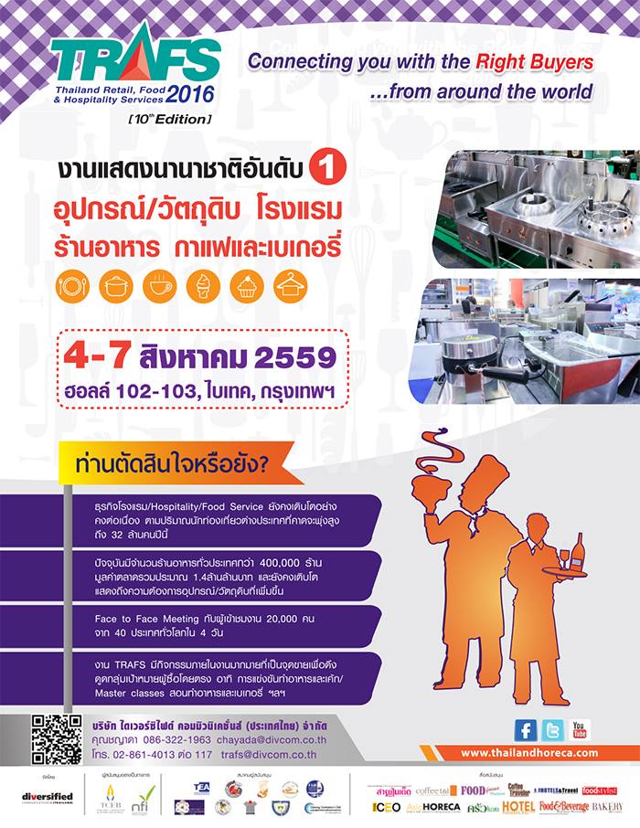 TRAFS 2016 ปีที่ 10 งานแสดงนานาชาติ อุปกรณ์ วัตถุดิบ อาหาร/ เครื่องดื่ม สำหรับธุรกิจ โรงแรม และ Food Service พร้อมเสิร์ฟ รับผู้ซื้อ 20,000 คน จากกว่า 30 ประเทศทั่วโลก คาดเงินสะพัดกว่า 150 ล้านบาท