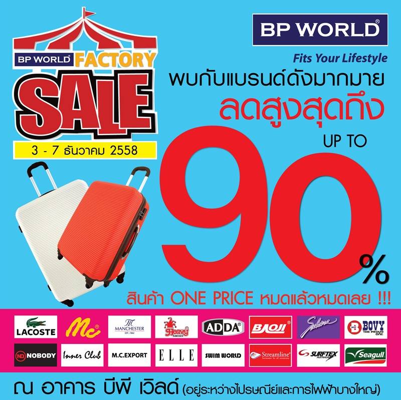 บีพี เวิลด์ ขอเชิญชวนทุกท่านมาร่วมงานมหกรรมสินค้าราคาพิเศษ ถูกสุดในรอบปี "BP WORLD FACTORY SALE 2015" และพบกับสินค้าแบรนด์ดังอีกมากมายที่มาร่วมลดราคาสูงสุดถึง 90% วันที่ : 3 - 7 ธันวาคม 2558 สถานที่ : อาคารสำนักงาน บีพี เวิลด์ ติดตามข้อมูลเพิ่มเติมได้ที่ www.bp-world.com facebook.com/bpworld.co.ltd