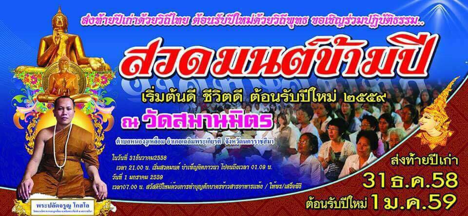 ส่งท้ายปีเก่าด้วยวิถีไทย ต้อนรับปีใหม่ด้วยวิถีพุทธ ขอเชิญร่วมปฏิบัติธรรม สวดมนต์ข้ามปี เริ่มต้นดี ชีวิตดี ต้อนรับปีใหม่ 2559 ณ วัดสมานมิตร ตำบลหนองงูเหลือม อำเภอเฉลิมพระเกียรติ จังหวัดนครราชสีมา