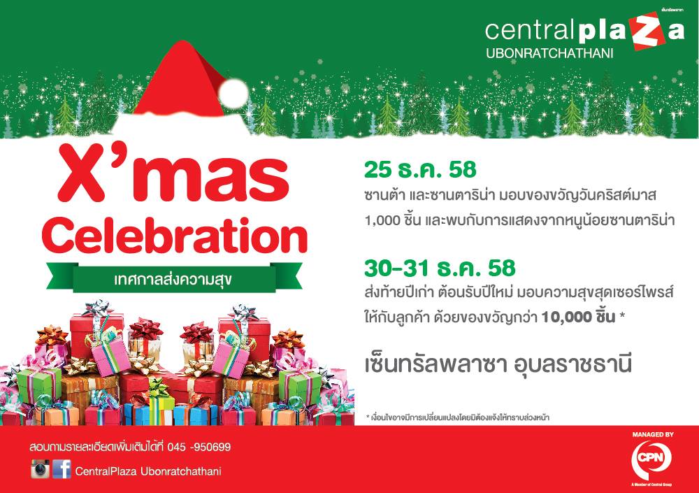 ส่งท้ายปีเก่า ต้อนรับปีใหม่ มอบความสุขสุดเซอร์ไพรส์ ให้กับลูกค้า ด้วยของขวัญกว่า 10,000 ชิ้น วันที่ : 30 - 31 ธันวาคม 2558 สถานที่ : ศูนย์การค้าเซ็นทรัลพลาซา อุบลราชธานี ติดตามข้อมูลเพิ่มเติมได้ที่ facebook.com/CentralPlazaUbonratchathani
