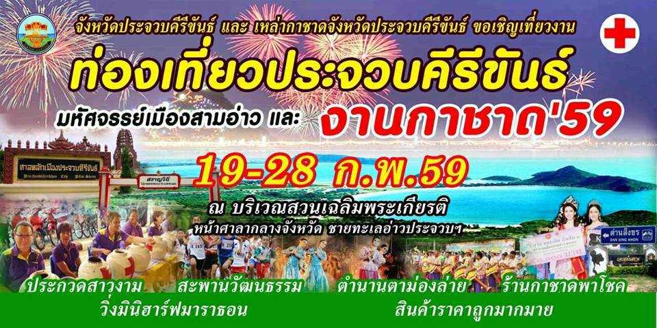 จังหวัดประจวบคีรีขันธ์ งานท่องเที่ยวประจวบคีรีขันธ์ มหัศจรรย์เมืองสามอ่าว และงานกาชาด ประจำปี 2559 ระหว่างวันที่ 19-28 กุมภาพันธ์ 2559 ณ บริเวณอ่าวประจวบฯ และสวนสาธารณะเฉลิมพระเกียรติ หน้าศาลากลางจังหวัดประจวบคีรีขันธ์ อ. เมือง จ.ประจวบคีรีขันธ์