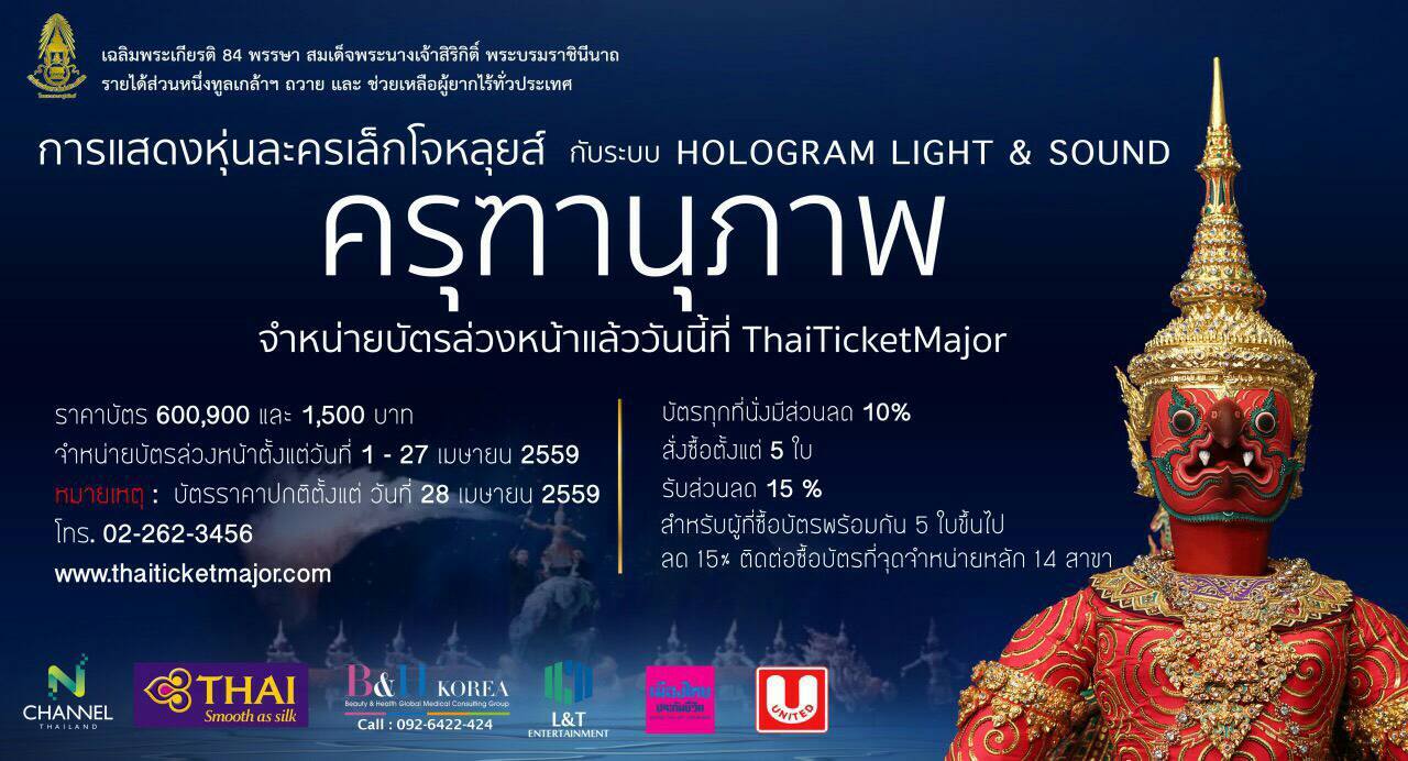"ครุฑานุภาพ" ร่วมเปิดประสบการณ์ใหม่กับสุดยอดนาฏกรรมแห่งสยามประเทศ สมจริงยิ่งกว่า ตระการตาเหนือจินตนาการ ๑๔ - ๑๗ กรกฎาคม ๒๕๕๙ นี้ ณ หอประชุมใหญ่ ศูนย์วัฒนธรรมแห่งประเทศไทย