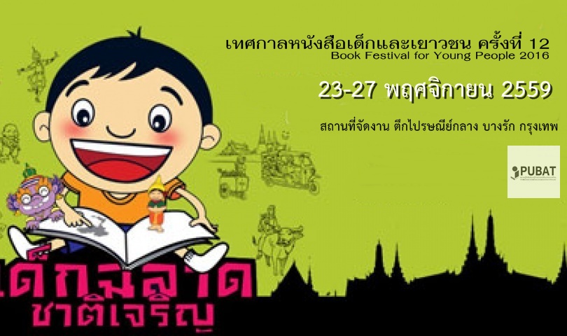 ตื่นตาตื่นใจและแต่งแต้มจินตนาการไปกับการอ่านหนังสือ ในงานเทศกาลหนังสือเด็กและเยาวชน ครั้งที่ 12 หรือ Book Festival for Young People 2016 จัดโดยสมาคมผู้จัดพิมพ์และผู้จำหน่ายหนังสือแห่งประเทศไทย ในวันที่ 23-27 พฤศจิกายน 2559 สถานที่จัดงาน ตึกไปรษณีย์กลาง บางรัก กรุงเทพ
