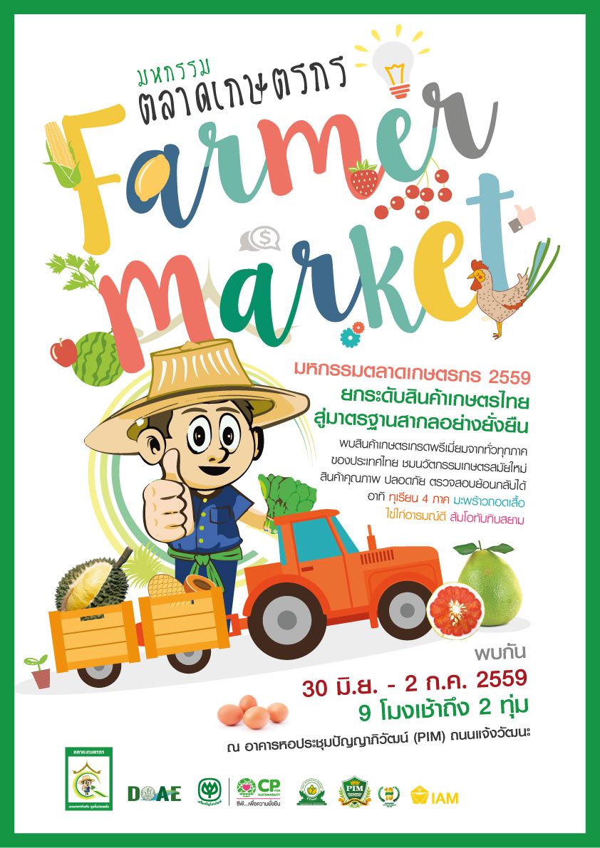 กรมส่งเสริมการเกษตร กระทรวงเกษตรและสหกรณ์ ร่วมกับ สถาบันการจัดการปัญญาภิวัฒน์ (พีไอเอ็ม) จัดงาน “มหกรรมตลาดเกษตรกร” ภายใต้แนวคิด “ตลาดเกษตรกร นวัตกรรมตลาดเพื่อผู้บริโภค” คัดเลือกสุดยอดสินค้าและผลิตภัณฑ์เกษตรเกรด Premium จาก “ตลาดเกษตรกร” ทั่วประเทศ มาเปิดตัวและจำหน่ายเพื่อเปิดโอกาสให้เกษตรกรผู้ผลิตได้พบกับผู้จัดจำหน่ายและผู้บริโภคโดยตรง พร้อมโชว์ผลงานการยกระดับมาตรฐานการผลิตและการจัดจำหน่ายสินค้าการเกษตร ด้วยองค์ความรู้ด้าน “การจัดการ” และ “การตลาดสมัยใหม่” เพื่อเสริมสร้างความเข้มแข็งให้แก่เกษตรกรไทย