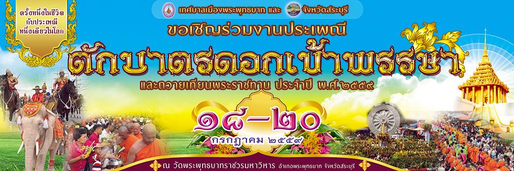 การท่องเที่ยวแห่งประเทศไทย (ททท.) สำนักงานลพบุรี ขอเชิญร่วมงานประเพณีตักบาตรดอกเข้าพรรษา และถวายเทียนพระราชทาน จังหวัดสระบุรี ประจำปี 2559 ระหว่างวันที่ 18 – 20 กรกฎาคม 2559 ณ วัดพระพุทธบาทราชวรมหาวิหาร ต.ขุนโขลน อ.พระพุทธบาท จ.สระบุรี