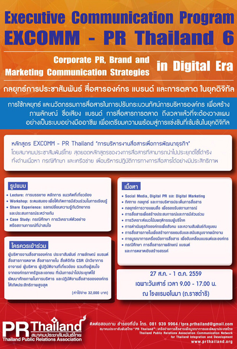 สมาคมประชาสัมพันธ์ไทย เปิดการอบรม “กลยุทธ์การสร้างแบรนด์และการสื่อสารการตลาด เพื่อการขับเคลื่อนองค์กรในยุคดิจิทัล : Corporate PR, Brand and Marketing Communication Strategies in Digital Era” ในหลักสูตรการบริหารงานสื่อสาร [Executive Communication Program: EXCOMM – PR Thailand 6] ระหว่าง 27 สิงหาคม – 1 ตุลาคม 2559 (ทุกวันเสาร์) ณ โรงแรมอโนมา ราชดำริ