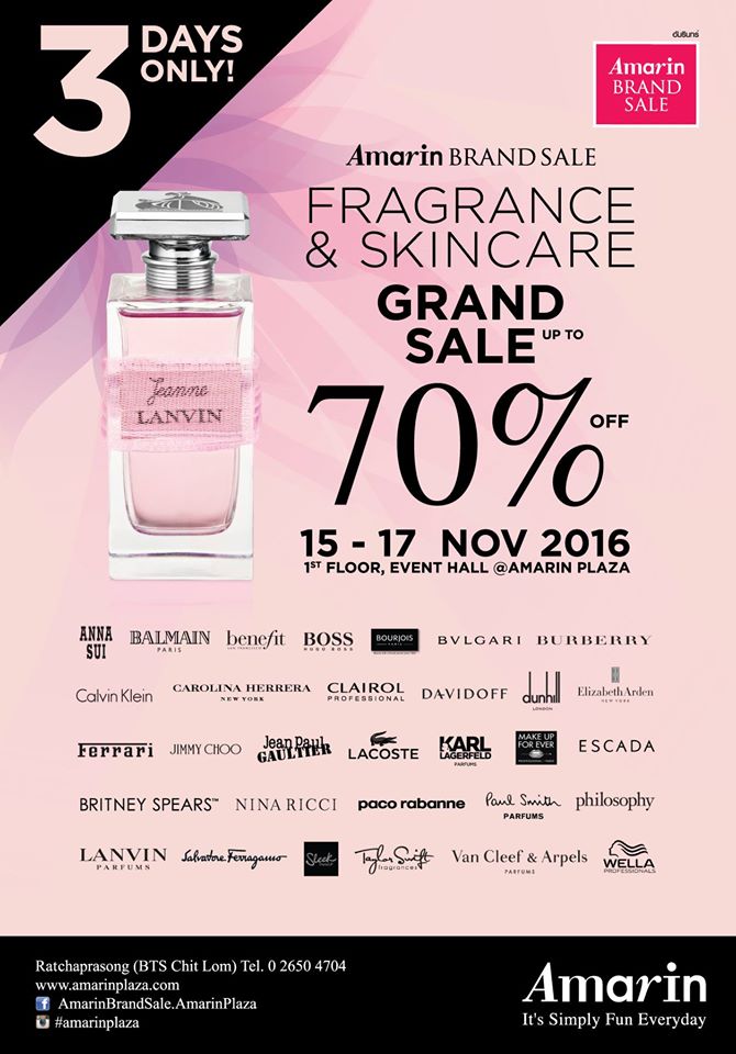 อัมรินทร์ แบรนด์เซล เปิดบิวตี้ฟลอร์ให้คุณเติมเสน่ห์ความหอมที่ใครๆ ต้องเหลียวมอง ในงาน เซลน้ำหอมครั้งยิ่งใหญโค้งสุดท้ายของปี “Amarin Brand Sale: Fragrance Skincare Sale Up To 70% ระหว่างวันที่ 15 - 17 พฤศจิกายน 2559 ณ อีเวนท์ฮอลล์ ชั้น 1 ศูนย์การค้าอัมรินทร์พลาซ่า ช้อปสุดคุ้มกับส่วนลดกระหน่ำสูงสุดถึง 70% กับขบวนสุดยอดน้ำหอมแบรนด์เนมระดับโลก ที่จะเนรมิตเสน่ห์ความหอมเย้ายวนชวนให้หลงใหลกับแบรนด์ดังอย่าง Anna Sui, BALMAIN Paris, Burberry, Bvlgari, Calvin Klein, Davidoff, Dunhill, Elizabeth Arden, Escada, Ferrari, BOSS, Jimmy Choo, Karl Largerfeld, Lacoste, Lanvin, Salvatore Ferragamo, Nina Ricci, Paco Rabanne, Paul Smith, Philosophy, Van Cleef Arpels, Jean Paul และ Vera Wang