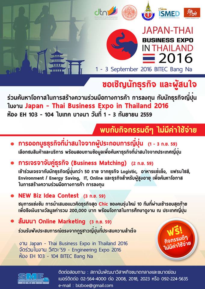ขอเชิญนักธุรกิจ และผู้สนใจ ร่วมค้นหาโอกาสในการสร้างความร่วมมือทางการค้า การลงทุน กับนักธุรกิจญี่ปุ่น ในงาน Japan - Thai Business Expo in Thailand 2016
