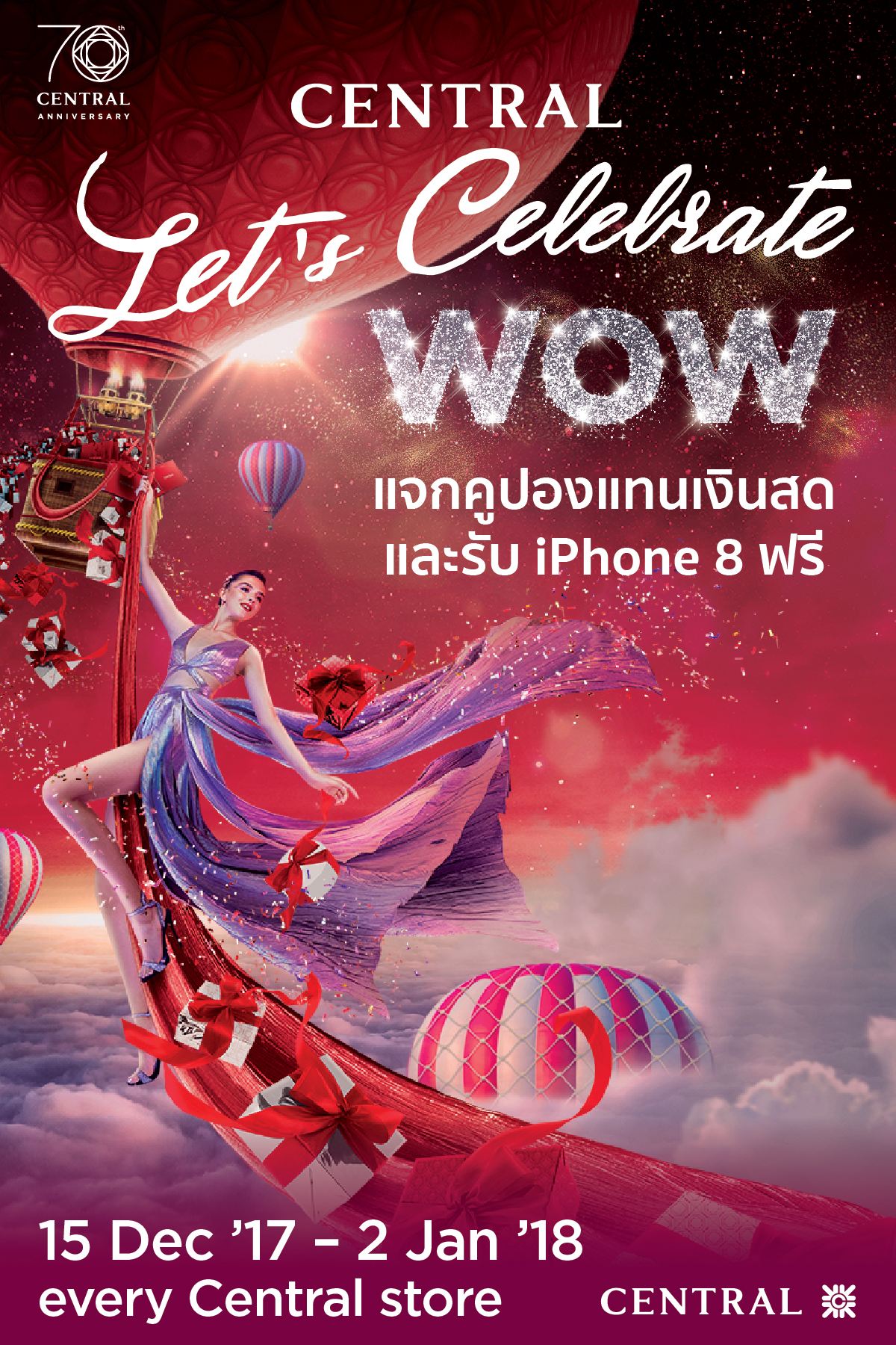 ห้างเซ็นทรัล จัดรายการ "Central Let's Celebrate WOW" (เซ็นทรัล เลทเซเลเบรท ว้าว) มอบเงินคืนทุกครั้งที่ช้อป พร้อมรับคูปองส่วนลดแทนเงินสดอีกเพียบ!! ช้อปสินค้าทุกชั้นทุกแผนก รับส่วนลดด้วย สติกเกอร์สูงสุด 40%, ลดเพิ่มสูงสุด 25% เมื่อช้อปผ่านบัตรเครดิตเซ็นทรัล เดอะ วัน และใช้คะแนน The 1 Card 2 เท่าของยอดช้อป หรือลดเพิ่มสูงสุด 12.5% เมื่อใช้คะแนน The 1 Card พิเศษ ลุ้นรับฟรี! IPhone 8 เมื่อมียอดช้อปฯ สะสมตลอดรายการตั้งแต่ 250,000 บาท ขึ้นไปด้วยบัตร MasterCard และรับสิทธิพิเศษเพิ่มเติมจากบัตรเครดิตชั้นนำ วันนี้ – 2 ม.ค.61 ที่ห้างเซ็นทรัลทุกสาขา