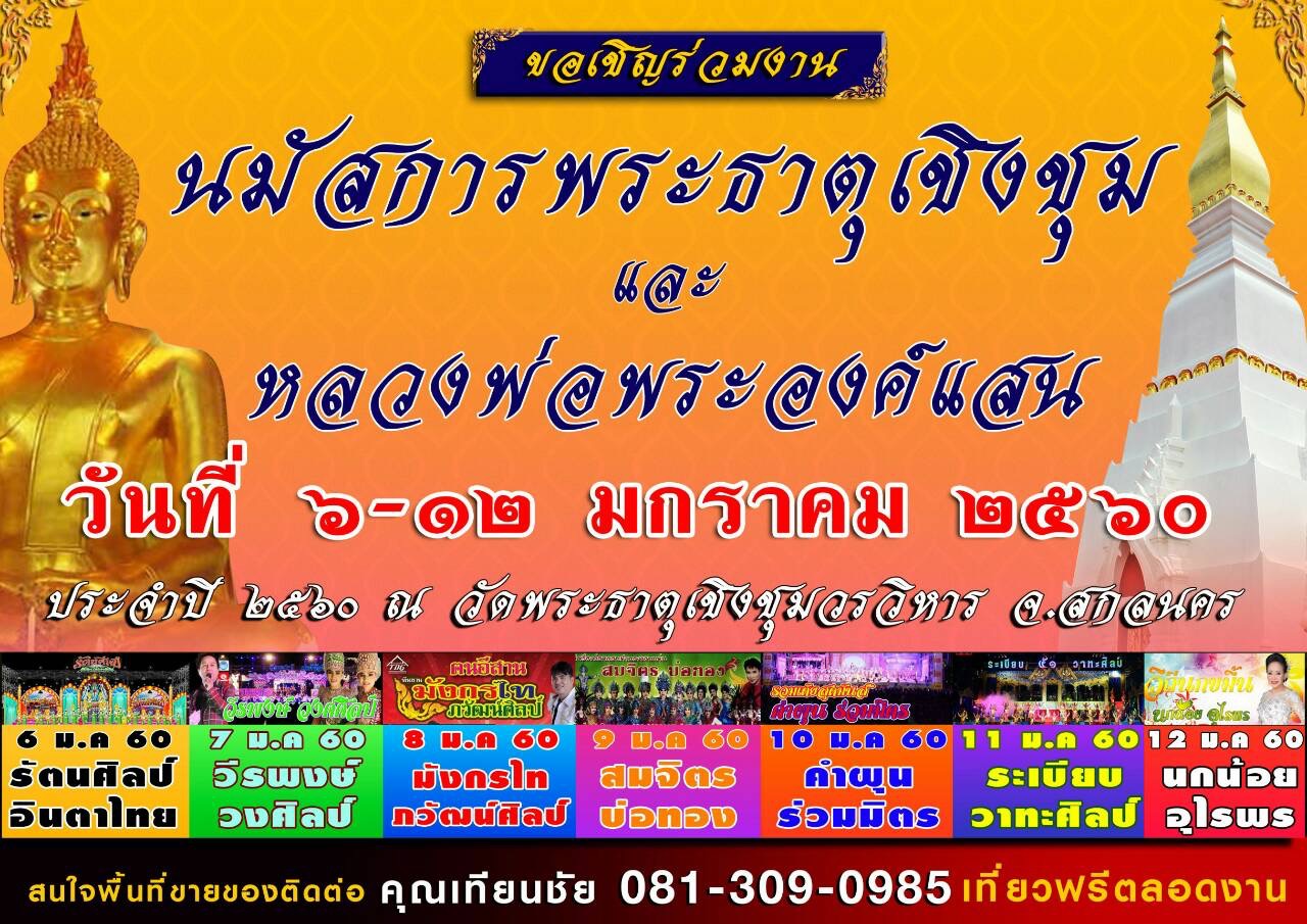 ขอเชิญเที่ยวงานประจำปี 2560 งานนมัสการพระธาตุเชิงชุมและหลวงพ่อพระองค์แสน ระหว่างวันที่ 6 - 12 มกราคม 2560 ณ วัดพระธาตุเชิงชุมวรวิหาร จังหวัดสกลนคร