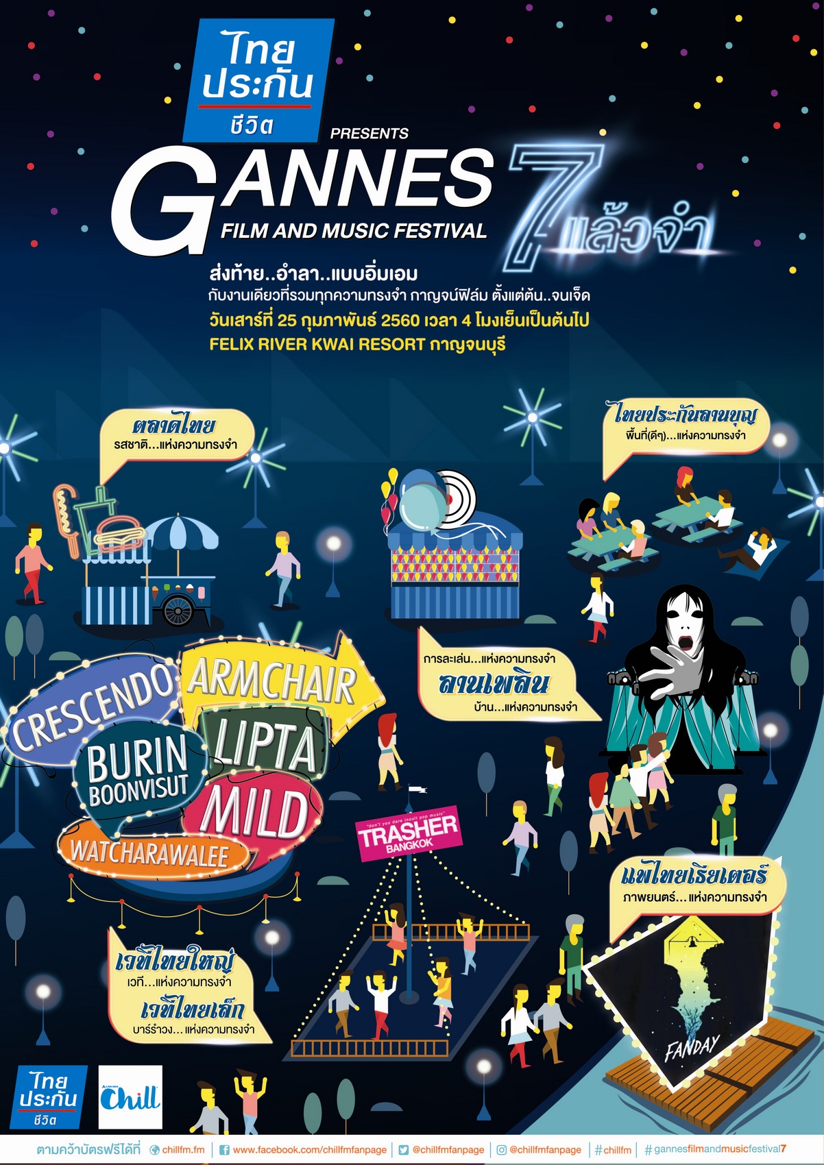 7 ปี กับทุกความทรงจำดีๆ ไทยประกันชีวิต พรีเซนต์ กาญจน์ ฟิล์ม แอนด์ มิวสิค เฟสติวัล ครั้งที่ 7 เทศกาลภาพยนตร์และดนตรีเมืองกาญจน์ ที่ครั้งส่งท้ายนี้คลื่น ชิล 104.5 เอฟเอ็ม ตั้งใจจัดธีม “7 แล้วจำ” ชวน คอหนัง-คอเพลง มาหวนรำลึกความหลังจากศิลปินคุณภาพที่เคยตบเท้าสร้างความสนุก แถมล่องแพดูหนังรัก โรแมนติกกลางแม่น้ำแคว พร้อมรวบรวมทุกความทรงจำที่เคยมีความสุขร่วมกันตลอด 7 ปีที่ผ่านมาเป็นการส่งท้าย ที่เราจะจำกัน...ไม่ลืม !! ในวันเสาร์ที่ 25 กุมภาพันธ์นี้ ที่ โรงแรมเฟลิกซ์ ริเวอร์แคว รีสอร์ท จ.กาญจนบุรี ตั้งแต่เวลา 16.00 น. เป็นต้นไป