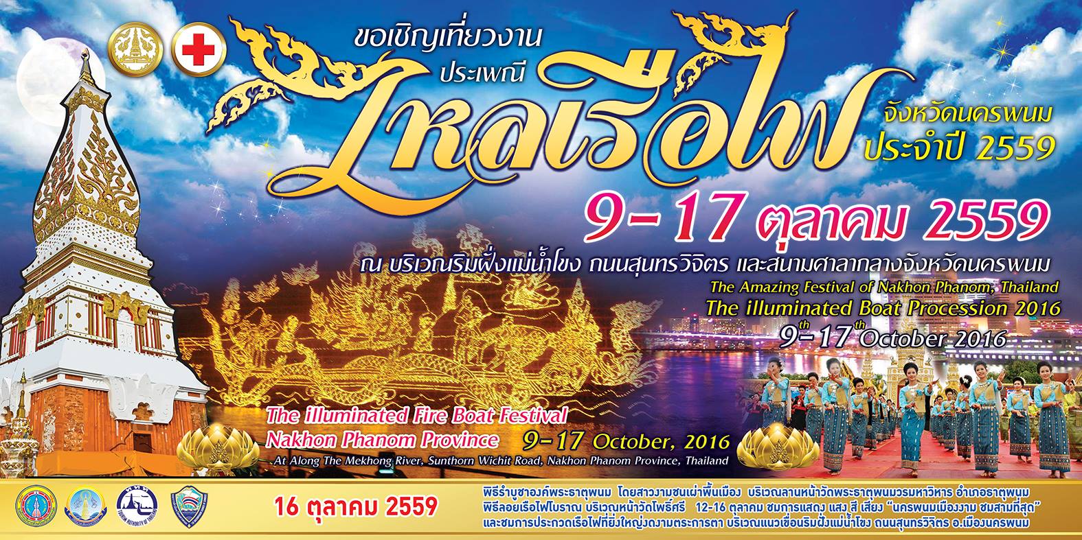 จังหวัดนครพนม กำหนดจัดงานประเพณีไหลเรือไฟและงานกาชาดจังหวัดนครพนม ประจำปี 2559 ขึ้นระหว่างวันที่ 9-17 ตุลาคม 2559 ณ บริเวณศาลากลางจังหวัดนครพนม และริมฝั่งแม่น้ำโขง เขตเทศบาลเมืองนครพนม 9 ต.ค.59 เวลา 18.30 น. พิธีเปิด "งานประเพณีไหลเรือไฟจังหวัดนครพนม ประจำปี 2559" ในวันอาทิตย์ที่ 9 ตุลาคม 2559 เวลา 18.30 น. ณ เวทีกลาง บริเวณสนามหน้าศาลากลางจังหวัดนครพนม และเปิดงานกาชาดจังหวัดนครพนม ประจำปี 2559 ณ เวทีร้านกาชาด บริเวณหน้าอาคารศาลากลางจังหวัดนครพนม (หลังเดิม) 16 ต.ค.59 เวลา 09.00 น. พิธีรำบูชาองค์พระธาตุพนม เวลา 12.00 น. พิธีอัญเชิญไฟพระฤกษ์และขบวนแห่ปราสาทผึ้ง เวลา 17.30 น. พิธีลอยเรือไฟโบราณ เวลา 18.30 น. พิธีเปิด "มหกรรมไหลเรือไฟนครพนม" ณ เวที บริเวณแลนด์มาร์ค หน้าสำนักงานป่าไม้จังหวัดนครพนม ริมฝั่งแม่น้ำโขง เขตเทศบาลเมืองนครพนม - ชมการไหลเรือไฟของเรือไฟที่เข้าประกวดจากอำเภอและหน่วยงานต่างๆ ประกอบพลุบนผิวน้ำโขง และพลุบนท้องฟ้าเหนือลำน้ำโขงในคืนพระจันทร์เต็มดวง 12-16 ต.ค.59 ชมการแสดงแสงสีเสียง "นครพนมเมืองงาม ชมสามที่สุด" (ความยาว 50 นาที) ประกอบด้วย : องค์ที่ 1 นครพนมเมืองงาม (10 นาที) องค์ที่ 2 เขตคามความศักดิ์สิทธิ์ (10 นาที) องค์ที่ 3 ที่สถิตย์พญาศรีสัตตนาคราช (10 นาที) องค์ที่ 4 งามระดับชาติไหลเรือไฟ นครพนม และ (10 นาที) องค์ที่ 5 ชื่นชมสามที่สุด (10 นาที) 12-15 ต.ค.59 การแข่งเรือยาวชิงถ้วยพระราชทาน ณ ริมฝั่งแม่น้ำโขง บริเวณหน้าวัดพระอินทร์แปลง ใกล้สวนอาหารวิวโขง