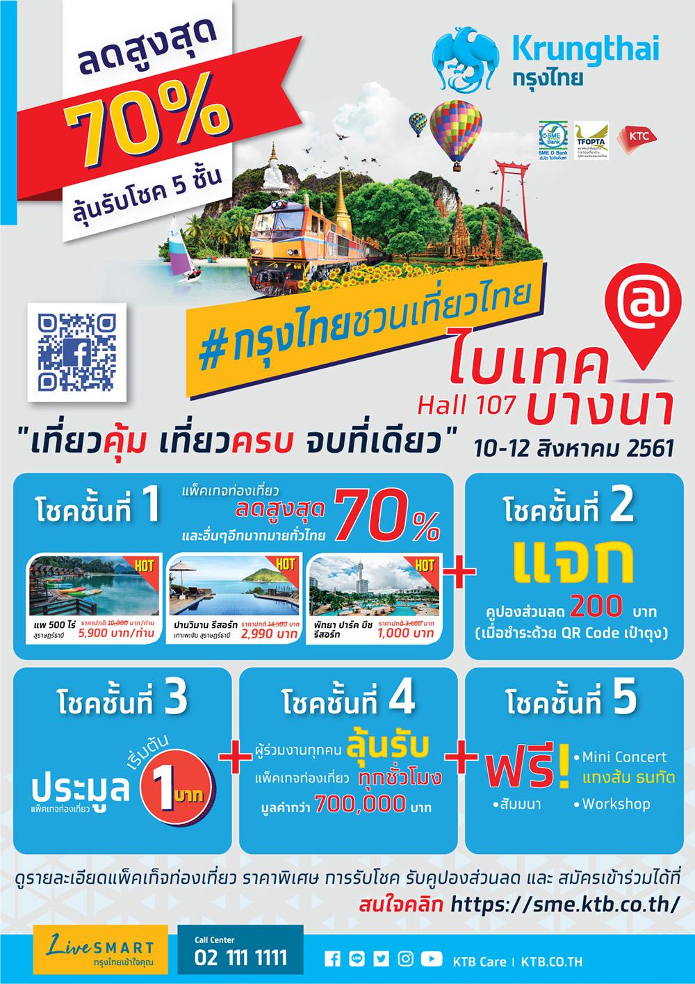 ไม่ว่าคุณจะเป็นนักเดินทางสายแข็ง สายกิน หรือสายชิล เที่ยวครั้งไหนก็ไม่ฟินเท่า #กรุงไทย ชวนเที่ยวไทย สุดยอดมหกรรมการท่องเที่ยว ที่จัดขึ้นโดย บมจ.ธนาคารกรุงไทย ร่วมกับ ธนาคารพัฒนา วิสาหกิจขนาดกลางและขนาดย่อมแห่งประเทศไทย (SME Development Bank) และสมาพันธ์ธุรกิจ การท่องเที่ยวส่วนภูมิภาคแห่งประเทศไทย (TFOPTA) ณ ศูนย์นิทรรศการและการประชุมไบเทค บางนา ระหว่างวันที่ 10 – 12 สิงหาคม 2561 นอกจากจะได้เพลิดเพลินกับโปรโมชั่น แพ็คเกจ ส่วนลดสูงสุด 70% จากผู้ประกอบการธุรกิจท่องเที่ยวชั้นนำ ที่ครอบคลุมทั้ง โรงแรม เรือ ร้านอาหาร สวนสนุก ฯลฯ ภายในงานยังเตรียมกิจกรรมเวิร์คช้อปและงานเสวนาจากเหล่ากูรูท่องเที่ยวไว้อย่างครบเครื่อง เริ่มจาก