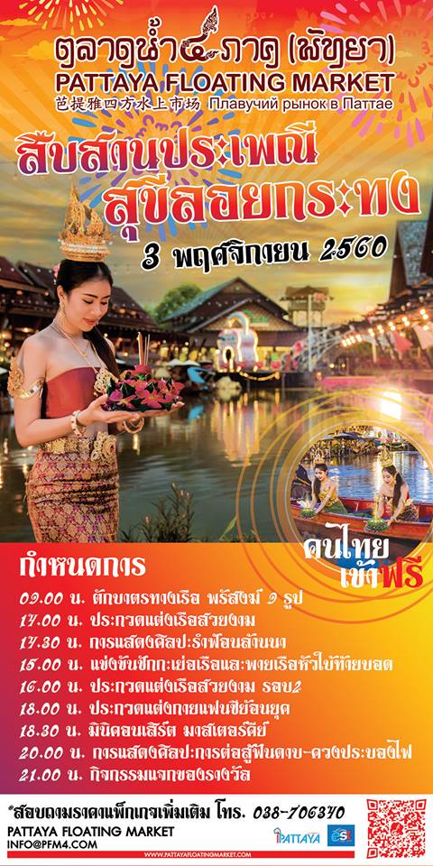 ขอเชิญทุกท่านร่วมงานลอยกระทงประจำปี ๒๕๖๐ ครบรอบ ๙ ปี ตลาดน้ำ ๔ ภาค (พัทยา) พบกิจกรรมพิเศษมากมาย มินิคอนเสิร์ตมาสเตอร์คีย และพบกับน้ององุ่น ไทยพิณอินเตอร์