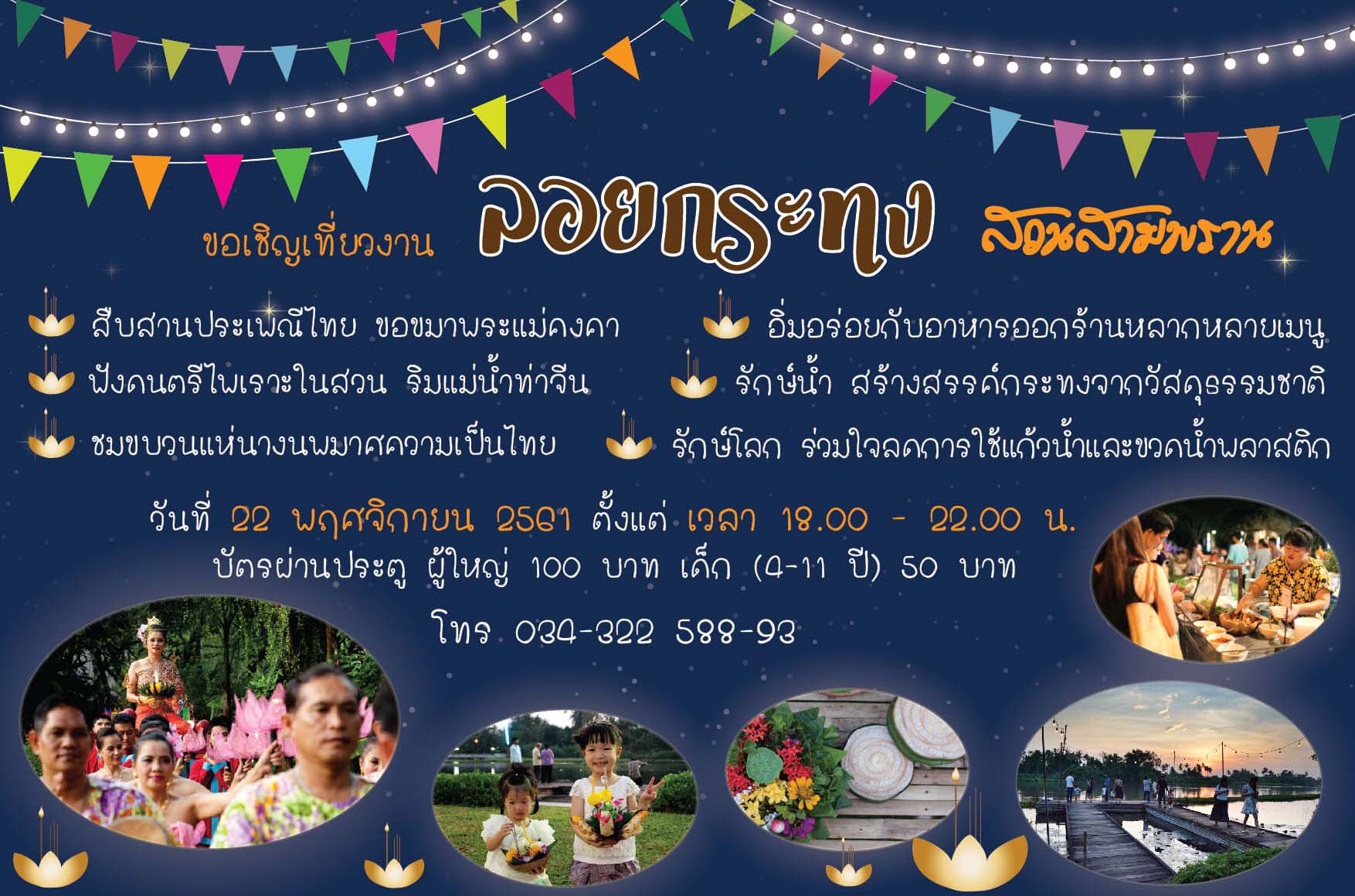 โอกาสดีๆ แบบนี้ หนึ่งปีมีแค่ครั้งเดียว ขอเชิญมาร่วมสืบสานประเพณีลอยกระทง ขอขมาพระแม่ คงคา ณ ริมสายน้ำท่าจีน สวนสามพราน อ.สามพราน จ.นครปฐม เริ่มเก็บเกี่ยวความสุขกันได้ตั้งแต่เวลา 16.00 -22.00 น.