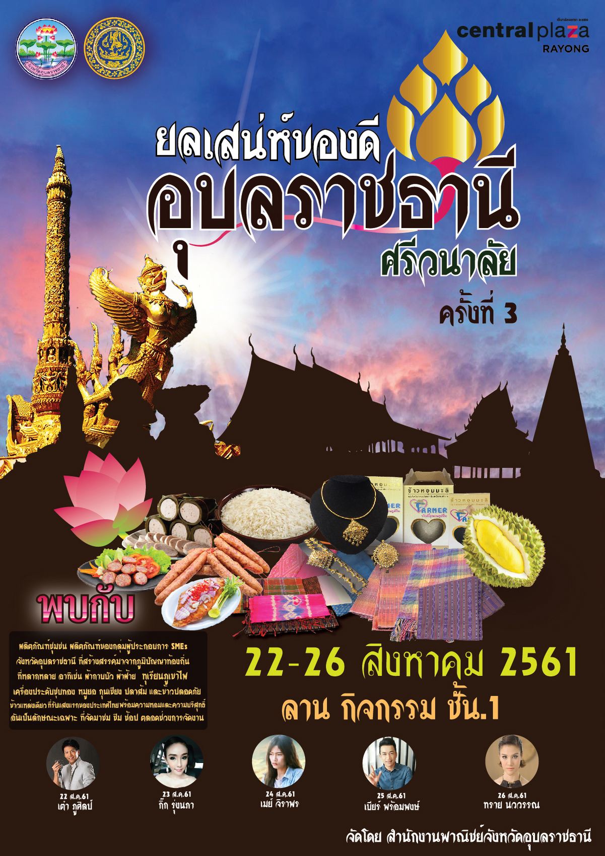 สำนักงานพาณิชย์จังหวัดอุบลราชธานี ขอเชิญเที่ยวงานยลเสน่ห์ของดีอุบลราชธานีศรีวนาลัยครั้งที่ 3 ณ ศูนย์การค้าเซ็นทรัลพลาซาระยอง ภายในงานพบกับ ผลิตภัณฑ์ชุมชนที่สร้างสรรค์จากภูมิปัญญาท้องถิ่น อาทิ ทุเรียนภูเขาไฟ รสชาติหวาน มัน กรอบนอกนุ่มใน กลิ่นไม่ฉุน, ผ้ากาบบัว ลายผ้าเอกลักษณ์ประจำจังหวัดอุบลราชธานี, หมูยอ จังหวัดอุบลฯ เนื้อแน่นไม่ผสมแป้ง, ก๋วยจั๊บญวน อีกหนึ่งเมนูฮิตประจำจังหวัด, ข้าวปลอดสารเคมี, เครื่องประดับชุบทอง, ผ้าฝ้ายทอมือ, สมุนไพรแปรรูป, หมอนยางพารา และสินค้าอื่น ๆ อีกมากมาย