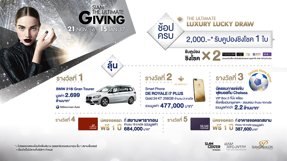 ช้อปครบทุก 2,000 บาท รับคูปองชิงโชค 1 ใบ • ลูกค้าเอไอเอส(ต้องกดรหัสแลกเอไอเอสพอยท์ 10 พอยท์เพื่อรับสิทธิ์) , สมาชิกบัตรเครดิต AEON, สมาชิกบัตรเครดิต SCB, สมาชิกบัตร Platinum M card, VIZ Card รับคูปอง 2 ใบ • จำกัด 100 ใบ/ท่าน / วัน เขียนชื่อ ที่อยู่ เบอร์โทรศัพท์ หย่อนใส่กล่องภายในศูนย์การค้าสยามพารากอน, สยามเซ็นเตอร์และสยามดิสคัฟเวอรี่ ณ จุด Redemption ประจำศูนย์ฯ • หมดเขต รับชิ้นส่วนวันที่ 15 ม.ค. 60 • จับรางวัล Grand Lucky Draw ในวันที่ 24 ม.ค. 60 ที่ สยามพารากอน • ประกาศรายชื่อผู้โชคดีวันที่ 26 ม.ค.- 28 ก.พ.60 ทางเว็บไซต์ www.siamparagon.co.th, www.siamcenter.co.th, www.siamdiscovery.co.th และเคาน์เตอร์ลูกค้าสัมพันธ์ ศูนย์การค้าสยามพารากอนสยามเซ็นเตอร์ และสยามดิสคัฟเวอรี่ • ผู้โชคดีต้องติดต่อรับรางวัลภายใน 30 วัน หลังจากประกาศผลรายชื่อ มิเช่นนั้นจะถือว่าสละสิทธิ์และทางบริษัทจะทำการติดต่อผู้โชคดีสำรองในลำดับถัดไป • ผู้ได้รับรางวัลต้องชำระภาษี ณ ที่จ่าย 5 % เป็นเงินสดตามคำสั่งสรรพากร ทป 101/2544 • ผู้ได้รับรางวัลต้องนำมูลค่าของรางวัลและค่าหักภาษี ณ ที่จ่าย ไปรวมกับรายได้ เพื่อยื่นภาษีเงินได้บุคคลธรรมดาต่อกรมสรรพากรในปลายปีที่ได้รับรางวัล • ของรางวัลไม่สามารถโอนให้ผู้อื่น และไม่สามารถเปลี่ยนแปลงเป็นเงินสด หรือรางวัลอื่นๆได้ • ผู้ได้รับรางวัลรถยนต์ BMW ต้องชำระค่าใช้จ่าย, ค่าธรรมเนียม และค่าภาษีที่เกี่ยวข้องทั้งหมดตามเงื่อนไขของบริษัทฯ • ผู้ที่ได้รางวัลบัตรชมฟุตบอลทีมChealseaพร้อมตั๋วเครื่องบินไป-กลับ จะต้องเดินทางไปตามรอบที่ระบุ และวันเวลาที่ทางบริษัทฯกำหนดเท่านั้น ไม่สามารถเปลี่ยนแปลงได้ • คำตัดสินของคณะกรรมการถือเป็นเด็ดขาด และสิ้นสุด • ผู้ได้รับรางวัลต้องพำนักอาศัยอยู่ในประเทศไทยเท่านั้น • พนักงานร้านค้าในสยามพารากอน, สยามเซ็นเตอร์, สยามดิสคัฟเวอรี่, พนักงานบริษัทสยามพิวรรธน์ จำกัด และบริษัทฯ ในเครือทั้งหมด รวมทั้งผู้ที่เกี่ยวข้อง ไม่มีสิทธิ์เข้าร่วมรายการ • ขอสงวนสิทธิ์ในการนำภาพผู้โชคดีที่ได้รับรางวัล เผยแพร่เพื่อการประชาสัมพันธ์ในโอกาสต่างๆ • ตรวจสอบเงื่อนไขเพิ่มเติม ณ เคาน์เตอร์ RedemptionSiam Paragonชั้น M ฝั่ง Star Dome หรือ เคาน์เตอร์ RedemptionSiam Center ชั้น 1 หรือ เคาน์เตอร์ Redemption ชั้น G, 4 สยามดิสคัฟเวอรี่