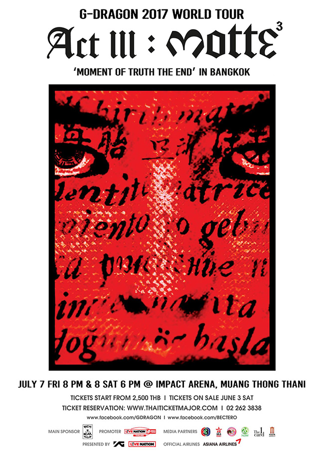 G-DRAGON ซูเปอร์สตาร์สุดฮอตแห่งวงการเคป๊อบ กลับมาอีกครั้ง พร้อมเวิล์ดทัวร์สุดยิ่งใหญ่ ก่อนเข้ากรม “G-DRAGON 2017 WORLD TOUR ” ปักหมุดประเทศไทย วันที่ 7-8 กรกฏาคม 2560 ที่อิมแพ็ค อารีน่า เมืองทองธานี บัตรราคาเริ่มต้นที่ 2,500 บาท เปิดจำหน่ายบัตรทั่วไปพร้อมกันในวันเสาร์ที่ 3 มิ.ย. 2560 ที่ไทยทิคเก็ตเมเจอร์ หรือ จำหน่ายทาง www.thaiticketmajor.com โทร 02262-3838