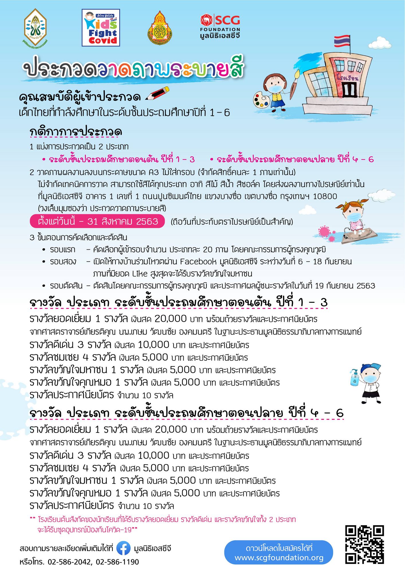 มูลนิธิเอสซีจี ร่วมกับ มูลนิธิธรรมาภิบาลทางการแพทย์ และสำนักงานคณะกรรมการการศึกษาขั้นพื้นฐาน (สพฐ.) เชิญชวนน้อง ๆ นักเรียนระดับประถมศึกษาทั่วประเทศ ไม่ว่าจะเป็นโรงเรียนรัฐบาลหรือเอกชน เข้าร่วมการประกวดวาดภาพระบายสี ในโครงการ "เด็กไทยสู้ภัยโควิด" (Thai Kids Fight COVID) ในหัวข้อ การดูแลตัวเองที่โรงเรียน ให้ห่างไกลจากโควิด -19 เพื่อให้เด็กนักเรียนได้เห็นความสำคัญของการป้องกันตนเอง รวมไปถึงการปลูกฝังเรื่องสุขลักษณะในชีวิตประจำวัน เช่น การสวมหน้ากากอนามัย การเว้นระยะห่าง การล้างมือทำความสะอาด เป็นต้น โดยเปิดรับสมัครตั้งแต่วันที่ 20 กรกฎาคม – 31 สิงหาคม 2563
