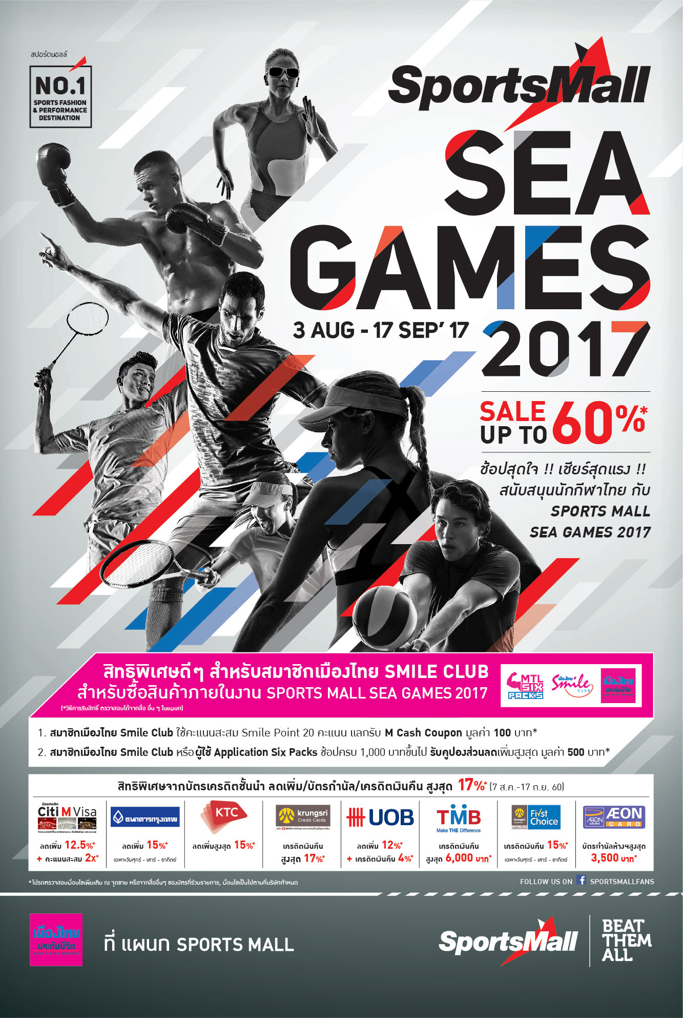 ร่วมส่งแรงใจเชียร์นักกีฬาไทยในเกมส์กีฬาระดับอาเซียน พร้อมอัพเดทสินค้าคอลเลคชั่นซีเกมส์ในงาน “SPORTS MALL SEA GAMES 2017” ตั้งแต่วันนี้ถึง 17 กันยายน 2560 ที่ แผนก SPORTS MALL เดอะมอลล์ ทุกสาขา เอ็มโพเรียม, พารากอน และบลูพอร์ต ดีพาร์ทเม้นต์สโตร์