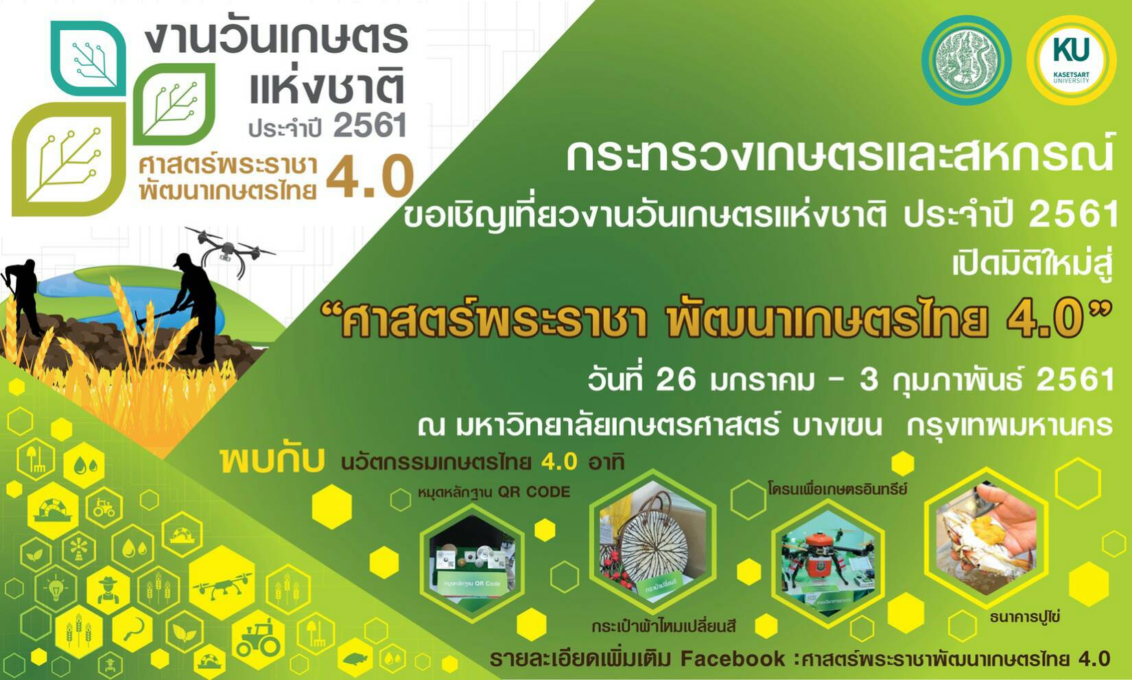 งานวันเกษตรแห่งชาติประจำปี 2561 โดย กระทรวงเกษตรและสหกรณ์ ร่วมกับ มหาวิทยาลัยเกษตรศาสตร์ กำหนดงานระหว่างวันที่ 26 มกราคม ถึง 3 กุมภาพันธ์ 2561 ภายใต้ธีมงาน “ร่วมกันก้าวไป เกษตรไทย 4.0” ณ มหาวิทยาลัยเกษตรศาสตร์ บางเขน ซึ่งมีวัตถุประสงค์หลัก เพื่อเผยแพร่ผลงานด้านการพัฒนาการเกษตร ผลงานวิชาการ ผลงานวิจัย การบริการวิชาการ ตลอดจนการถ่ายทอดความรู้ทางด้านเทคโนโยลี และนวัตกรรมของภาครัฐ และภาคเอกชน ให้แก่เกษตรกร นักเรียน นิสิต นักศึกษา และประชาชนทั่วไป ได้นำไปบูรณาการและนำไปประยุกต์ใช้ในการประกอบอาชีพหรือในการดำเนินชีวิตประจำวันต่อไป นอกจากนี้แล้วยังมีการจำหน่ายสินค้ามากมายหลายประเภท ให้เลือกซื้อ เลือกชม เลือกชิมได้ภายในงาน อาทิ สินค้า OTOP ประจำท้องถิ่น ผลิตภัณฑ์ผ้าฝ้ายแปรรูป (เครื่องแต่งกาย) ผ้าไหม ผ้าฝ้าย แปรรูป เสื้อสำเร็จรูป สมุนไพรเพื่อสุขภาพ เครื่องมือทางการเกษตร สินค้าทางการเกษตรทั้งอุปโภคและบริโภค ไม้ดอก ไม้ประดับนานาพันธุ์ ผัก ผลไม้ตามฤดูกาล มะขามหวานเลื่องชื่อ หอม กระเทียม งานฝีมือท้องถิ่น สัตว์เลี้ยงและอุปกรณ์ อาหารคาวหวานพื้นเมือง อุปกรณ์ทางการเกษตร โดยมีพื้นที่การจัดงาน กว่า 13 โซน