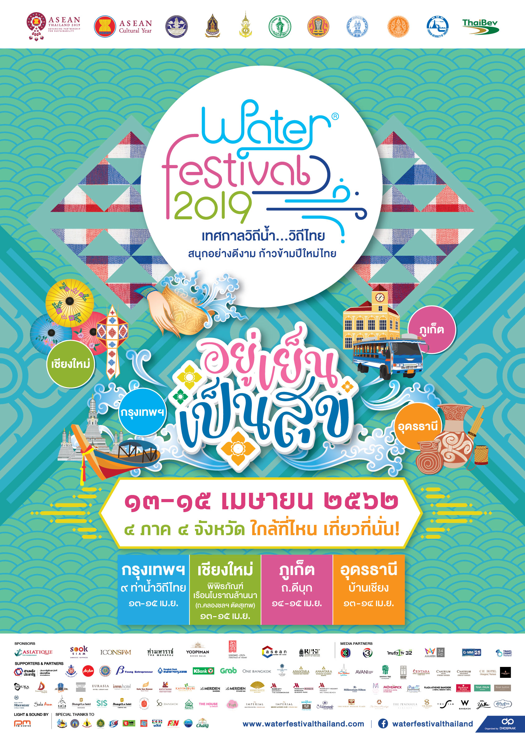 วันที่ 13-15 เมษายนนี้ !!! ขอเชิญเที่ยวงาน "Water Festival 2019 เทศกาลวิถีน้ำ...วิถีไทย" ที่จัดต่อเนื่องเป็น ครั้งที่ 5 ภายใต้แนวคิด "อยู่เย็น เป็นสุข" กับมหกรรมความสนุกอย่างดีงาม ก้าวข้ามปีใหม่ไทย สุขกาย สุขใจ ตลอดปี 2562 กำหนดการจัดงานขึ้นทั้งหมด 4 ภาคของประเทศไทย ได้แก่ ภาคกลาง (กรุงเทพมหานคร) ภาคเหนือ (เชียงใหม่) ภาคตะวันออกเฉียงเหนือ (อุดรธานี) และภาคใต้ (ภูเก็ต) ร่วมสัมผัสกับมนต์เสน่ห์แห่งวัฒนธรรมที่ผสานความร่วมสมัยอันดีงามที่สุดของประเทศไทย และต้อนรับปีวัฒนธรรมแห่งอาเซียน "ASEAN CULTURAL YEAR 2019"