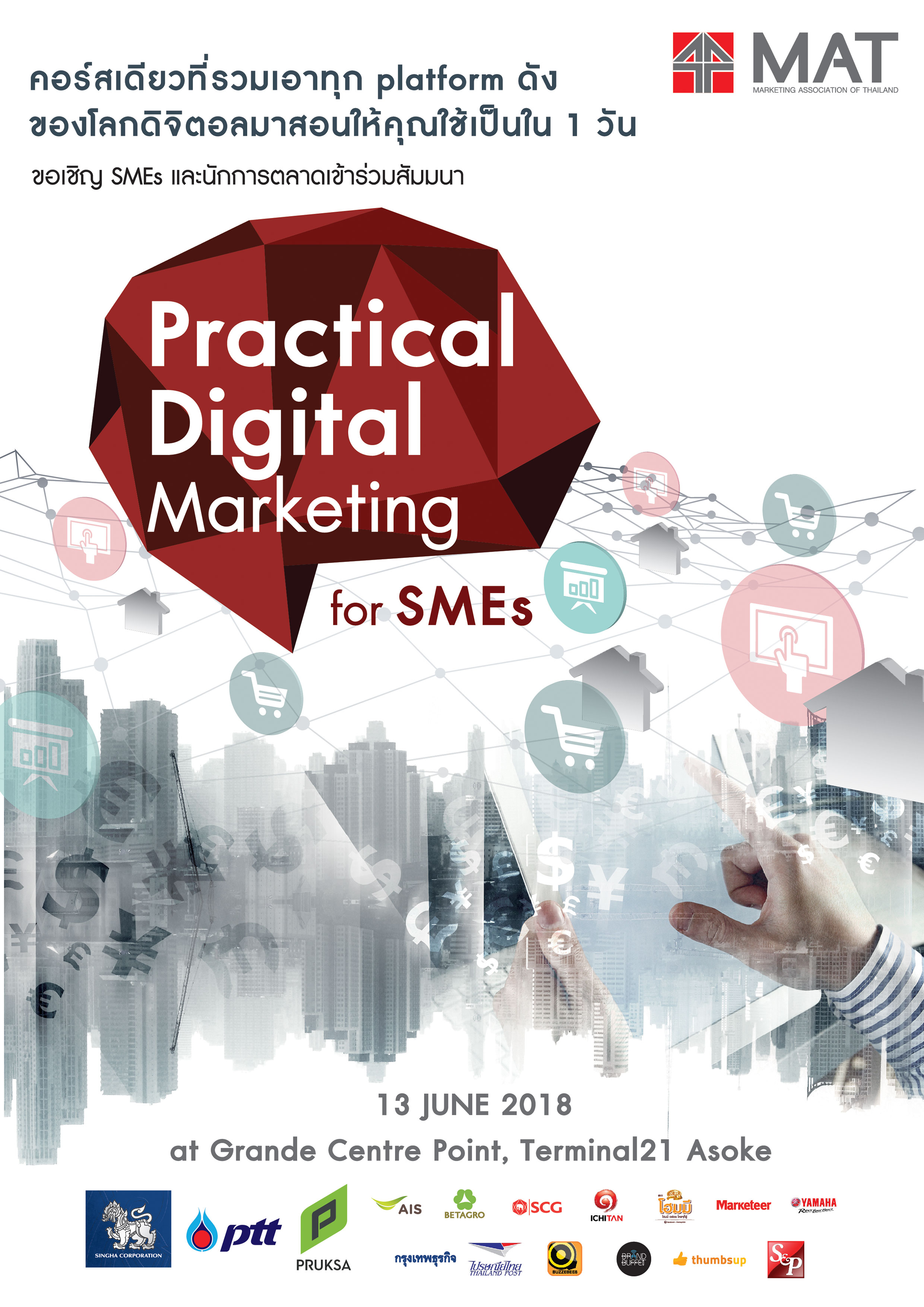 สมาคมการตลาดแห่งประเทศไทย ขอเชิญ SMEs และนักการตลาด ร่วมสัมมนา Practical Digital Marketing for SMEs ในวันที่ 13 มิถุนายน 2561 นี้ ณ โรงแรมแกรนด์ เซ็นเตอร์ พอยท์ เทอมินอล 21 คอร์สเดียวที่รวมเอาทุก Platform ดังของโลกดิจิทัล มาสอนให้คุณใช้เป็นใน 1 วัน พบกับวิทยากรที่มีความเชี่ยวชาญตรง ในการใช้งาน Google, Youtube, Facebook และ Line มาสอนเทคนิค และ Case ต่างๆ สำหรับ SMEs ให้สามารถนำไปใช้งานต่อได้ทันที