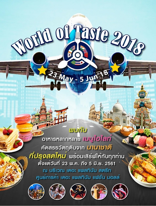 ศูนย์การค้า เดอะ แพลทินัม แฟชั่น มอลล์ ขอเชิญช้อป ชม ชิม อาหารนานาชาติในงาน World of Taste 2018 ที่คัดสรรเมนูเด็ด รสเลิศ พร้อมเสิร์ฟความอร่อยมาบนจานโปรด ที่การันตีได้ว่าทุกเมนูล้วนคัดสรรวัตถุดิบคุณภาพดี จากทั่วทุกมุมโลกมาปรุงเป็นอาหารจานอร่อยให้คุณได้ลองลิ้มชิมรสในราคาพิเศษมากกว่า 100 เมนู รวม 50 ร้านค้า สำหรับเมนูไฮไลท์ภายในงานเรียกได้ว่ามาแล้วต้องลองได้แก่ เมนูทุเรียนเชื่อม มันญี่ปุ่นเผา เบอร์เกอร์ หมูยอขุนด่าน อาหารทะเลนานาชนิด หมูแผ่น เกาหลีย่างชีส, หม่าล่า ปิ้งย่างสไตล์ยูนนาน, ซูชิ, ร้านเตี๋ยวมาแล้ว, ไก่โอ่ง, ร้านไอยรา ฟรุ๊ต และอื่นๆ อีกมากมาย