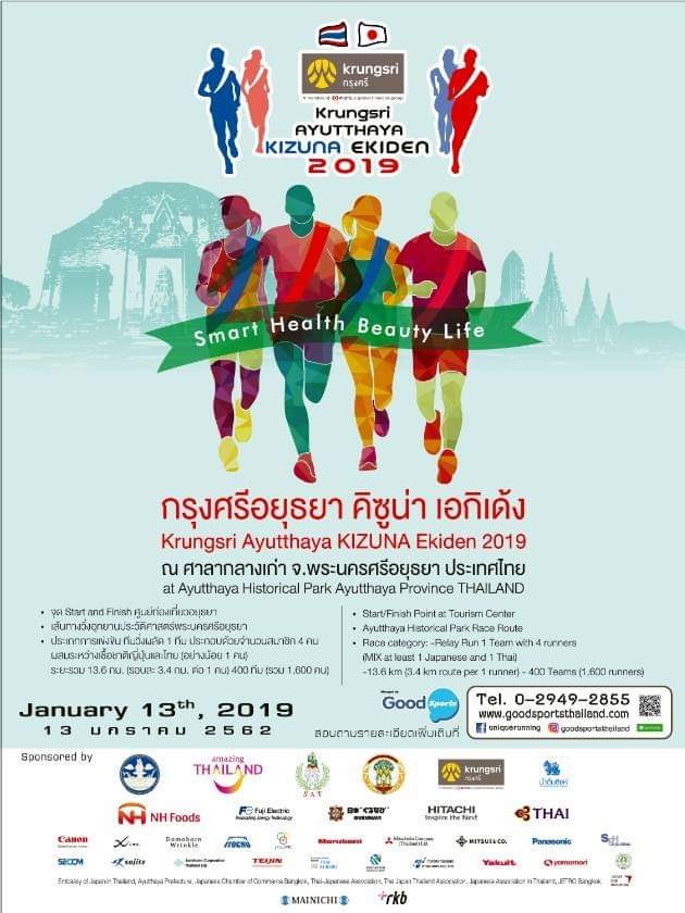 กระทรวงการท่องเที่ยวและกีฬา การท่องเที่ยวแห่งประเทศไทย สำนักพิมพ์ Mainichi แห่งประเทศญีปุ่น ร่วมกับธนาคารกรุงศรีอยุธยา จัดการแข่งขัน “อยุธยา คิซูน่า เอกิเด้ง 2019” (AYUTTHAYA KIZUNA EKIDEN 2019) กิจกรรมวิ่งผลัดสไตล์ญี่ปุ่นในวิถีแบบไทย ๆ ตอบรับกระแสคนรักสุขภาพต่อเนื่องเป็นปีที่ 3 เพื่อส่งเสริมความสัมพันธ์อันดีมากว่า 130 ปี ไทย-ญี่ปุ่น เนื่องจากการวิ่งผลัด “เอกิเด้ง” เป็นการแข่งขันที่มุ่งเน้น “ความสามัคคีเป็นน้ำหนึ่งใจเดียวกัน” ผ่านสัญลักษณ์การส่งต่อสายสะพาย “ทาซูกิ” (TASUKI)” เพื่อสื่อความหมายถึงหยาดเหงื่อแรงกาย และความมุ่งมั่นที่ส่งผ่านจากไหล่ต่อไหล่ มาถึงเพื่อนร่วมทีมแต่ละผลัด เป็นตัวแทนการส่งต่อจิตวิญญาณของนักวิ่งที่มีความหมายอย่างลึกซึ้ง นับเป็นงานวิ่งที่มีเสน่ห์ น่าสนุก และชวนให้ฮึกเหิม โดยจะจัดขึ้นในวันอาทิตย์ที่ 13 มกราคม พ.ศ.2562 ณ อุทยานประวัติศาสตร์พระนครศรีอยุธยา