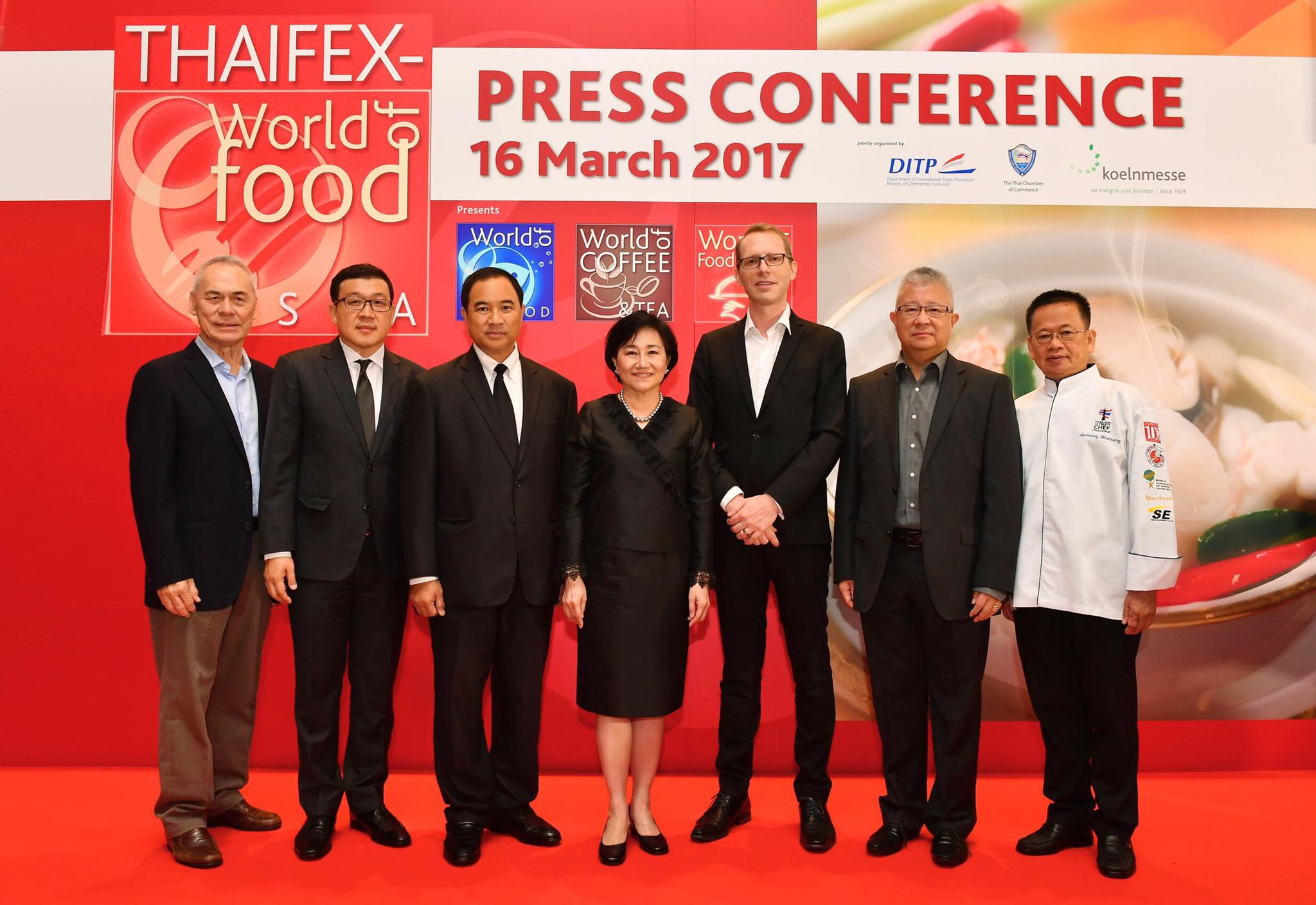 กรมส่งเสริมการค้าระหว่างประเทศ นำโดย นางมาลี โชคล้ำเลิศ อธิบดีกรมส่งเสริมการค้าระหว่างประเทศ พร้อมด้วย นายกลินท์ สารสิน รองประธานกรรมการหอการค้าไทย และมร.มาเธียส คุปเปอร์ กรรมการผู้จัดการ บริษัท โคโลญเมสเซ่ จำกัด แห่งเยอรมนี ร่วมกันจัดแถลงข่าวการจัดงาน THAIFEX – World of Food Asia 2017 ประกาศความพร้อมการจัดงาน มั่นใจไทยครองแชมป์ผู้จัดงานแสดงสินค้าอาหารที่ใหญ่และครบวงจรที่สุดในเอเชีย พร้อมผลักดันไทยเป็นศูนย์กลางการวิจัยพัฒนาและนวัตกรรมสำหรับอุตสาหกรรมอาหารโลก ณ ห้องแกรนด์บอลรูม โรงแรมโซ โซฟิเทล แบงค็อก ที่ผ่านมา