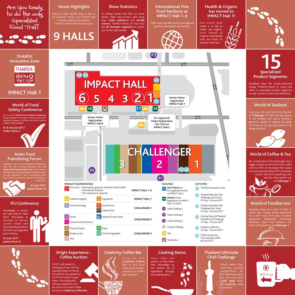 "งาน THAIFEX – World of Food Asia ในปีนี้ นอกจากการเพิ่มพื้นที่จัดงานเป็น 93,500 ตร.ม.แล้ว ในโซนของนิทรรศการยังเน้นการจัดแสดงสินค้าอาหาร 11 แนวโน้มเทรนด์อาหารโลก อาทิ อาหารมังสวิรัติ อาหารออร์แกนิค อาหารที่รับประทานด้วยมือ อาหารฮาลาล อาหารเพื่อสุขภาพ ฯลฯ รวมถึงการจัดแสดงผลิตภัณฑ์อาหารไทยมาตรฐานระดับส่งออก การันตีด้วยตราสัญลักษณ์ Thai Select และกิจกรรมไฮไลท์ต่างๆ ที่น่าสนใจ อาทิ การโชว์ศิลปะการปรุงกาแฟลาเต้จากบาริสต้าชื่อดัง การแข่งขันเมนูจานเด็ดจากเชฟนับพันคนเพื่อรับการคัดเลือกเข้าสู่รอบ 2018 World Congress"