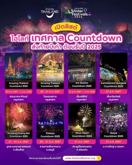 เตรียมตัวให้พร้อม แล้วไปเจอกันในงานเคาท์ดาวน์ ตื่นตาตื่นใจไปกับพลุสุดอลังการ และสนุกไปกับคอนเสิร์ตจากศิลปินชื่อดัง ชวนเพื่อน ๆ ชวนครอบครัว ไปร่วมเฉลิมฉลองต้อนรับปีใหม่ในงาน Countdown 2025 ด้วยกันนะ แต่ละงานจัดใหญ่ จัดเต็มมาก !