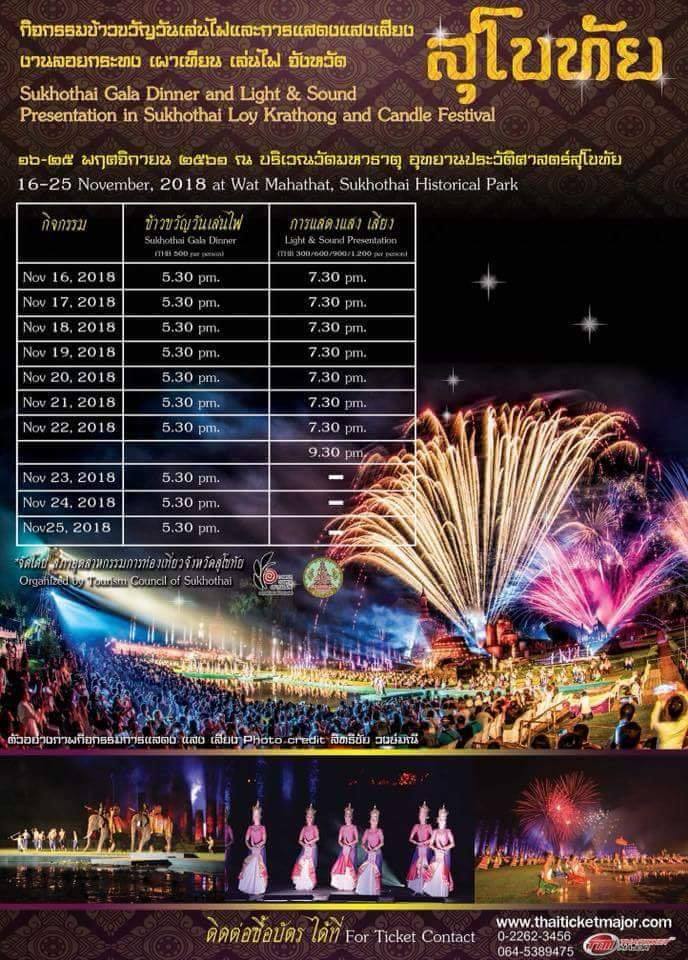 กิจกรรมการแสดงแสงเสียง ถือเป็น กิจกรรมหลักที่นักท่องเที่ยวที่มาเที่ยวงานลอยกระทงเผาเทียนเล่นไฟ ไม่ควรพลาด โดยเฉพาะในปีนี้ นอกจากจะได้รับชม ความสวยงามตระการตราของฉากการแสดง และนักแสดงมืออาชีพกว่า ๔๐๐ ชีวิต ที่ยังคงสร้างมนต์ขลังและความประทับใจไม่รู้ลืมให้กับผู้ชมแล้ว สภาอุตสาหกรรมการท่องเที่ยวจังหวัดสุโขทัย ได้รับการสนับสนุนจาก บริษัท เอปสัน ประเทศไทย จำกัด ในการจัดทำเทคนิค Projection Mapping ฉายภาพบนโบราณสถานประกอบการแสดง ด้วยเครื่องฉายภาพที่มีความสว่างมากที่สุดในประเทศไทย ซึ่งจะทำให้การแสดงแสงเสียงในปีนี้มีความพิเศษ และสวยงามตระการตา มากยิ่งขึ้น ตอกย้ำความเป็นผู้นำในด้านการจัดกิจกรรมการแสดงแสงเสียงในระดับประเทศที่ทุกท่านไม่ควรพลาด บัตรราคา ๓๐๐ ๖๐๐ ๙๐๐ และ ๑,๒๐๐ บาท การแสดงมีวันละ ๑ รอบ เวลา ๑๙.๓๐ น. ยกเว้นวันที่ ๒๒ พ.ย. เพิ่มอีก ๑ รอบเวลา ๒๑.๓๐ น.