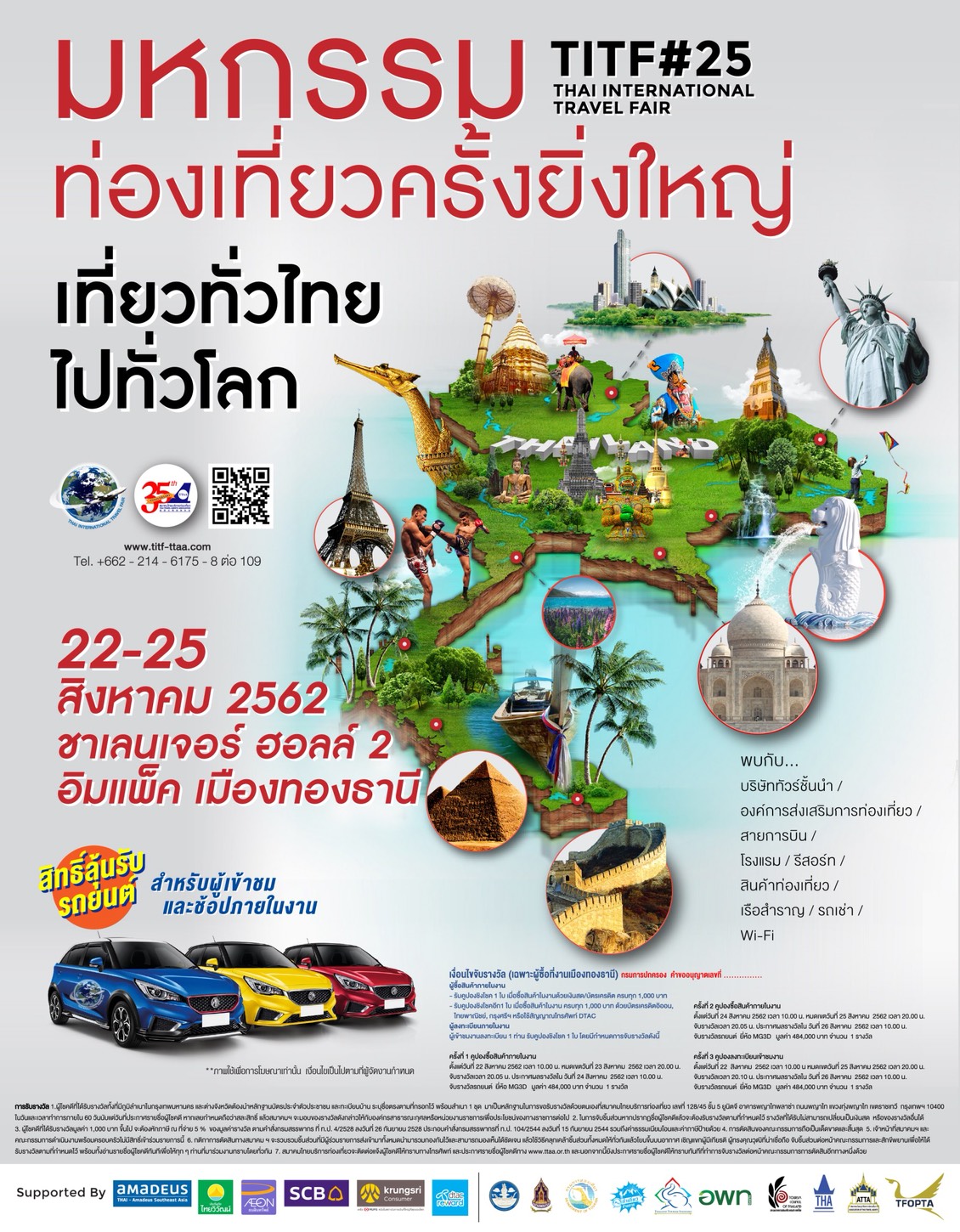 สมาคมไทยบริการท่องเที่ยวเตรียมจัดงานมหกรรมท่องเที่ยวครั้งยิ่งใหญ่ “เที่ยวทั่วไทย ไปทั่วโลก ครั้งที่ 25 (TITF#25)” งานใหญ่ประจำปีสำหรับผู้ที่รักการท่องเที่ยว งานเดียวที่รวมผู้ประกอบการธุรกิจท่องเที่ยวทั้งแพคเกจทัวร์เส้นทางต่างๆ ทั้งในประเทศและต่างประเทศชั้นนำ รวมถึงโรงแรม รีสอร์ท ตั๋วเครื่องบินราคาพิเศษ รถเช่า เรือสำราญ บัตรท่องเที่ยว บัตรรถไฟ และอุปกรณ์เกี่ยวกับการท่องเที่ยวครบครัน ภายในงานพบกับองค์การส่งเสริมการท่องเที่ยวจากหลายประเทศที่จะมานำเสนอสินค้าและเส้นทางแปลกใหม่ให้กับนักเดินทาง โดยผู้ประกอบการเตรียมมอบโปรโมชั่นสุดพิเศษจากบัตรเครดิตต่างๆ ที่เข้าร่วมในงาน พร้อมกิจกรรมมอบโชคภายในงาน แจกรถยนต์ถึง 3 คัน นอกจากนี้ยังมีไฮไลท์พิเศษที่จะมาร่วมสร้างสีสันให้กับงานอย่าง การโชว์แล่ปลาโอโทโร่สดๆ หนักกว่า 50 กิโลกรัม โดยองค์การส่งเสริมการท่องเที่ยวแห่งประเทศญี่ปุ่น และกิจกรรมความบันเทิงอีกมากมาย ครบเครื่องเรื่องท่องเที่ยวในงานเดียว โดยงานกำหนดจัดขึ้นระหว่างวันที่ 22 – 25 สิงหาคม 2562 เวลา 10.00 – 21.00 น. ณ ชาเลนเจอร์ อาคาร 2 อิมแพ็ค เมืองทองธานี