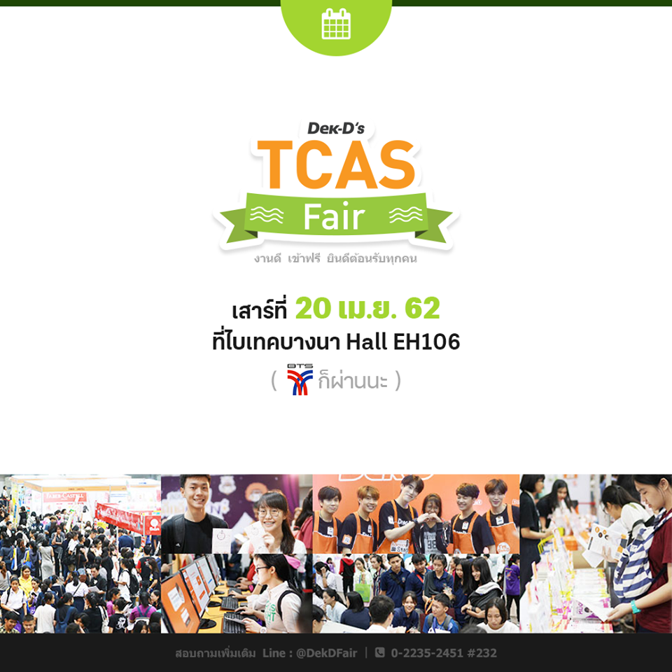เพิ่มทางเลือกคณะให้ ม.6-5-4 ข้อมูลแน่น TCAS 5 รอบ กับงาน Dek-D\\'s TCAS Fair วันเสาร์ที่ 20 เมษายน นี้ตั้งแต่เวลา 07:00 -19:00 น.ฮอลล์ 106 ไบเทคบางนา พบมหา\\'ลัย วิทยาลัย ติวเตอร์ กูรูเรื่องการศึกษาเพียบ