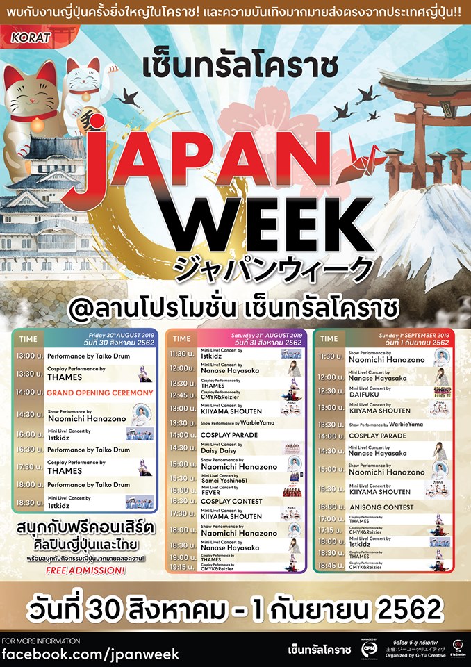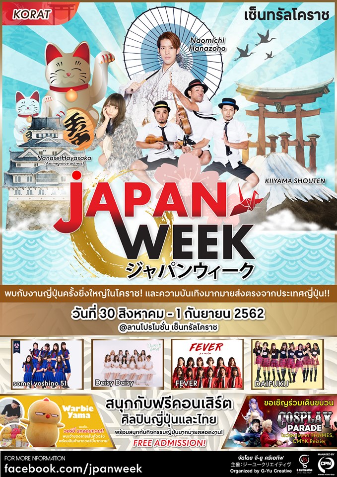 เจแปน วีค (JAPAN WEEK) งานเทศกาลญี่ปุ่นขนานแท้ที่ยกขบวนการแสดงสินค้าและอาหารพร้อมสัมผัสกลิ่นอายศิลปวัฒนธรรมส่งตรงจากญี่ปุ่น จัดเต็มทั้งโชว์พิเศษจากศิลปินไอดอลทั้งญี่ปุ่น-ไทย คอสเพลย์ คัฟเวอร์แดนซ์ และกิจกรรมเวิร์คช้อป ระหว่างวันที่ 30 ส.ค. - 1 ก.ย. 62 บริเวณ ลานกิจกรรม ชั้น 1